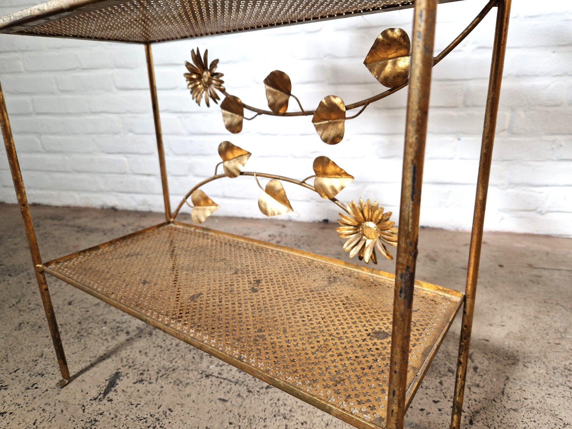 Fantastic looking French etagère with three tiers, a great patina on the gilded metal and floral decorations that just pop out in a very nice way. Made in the 1950s.