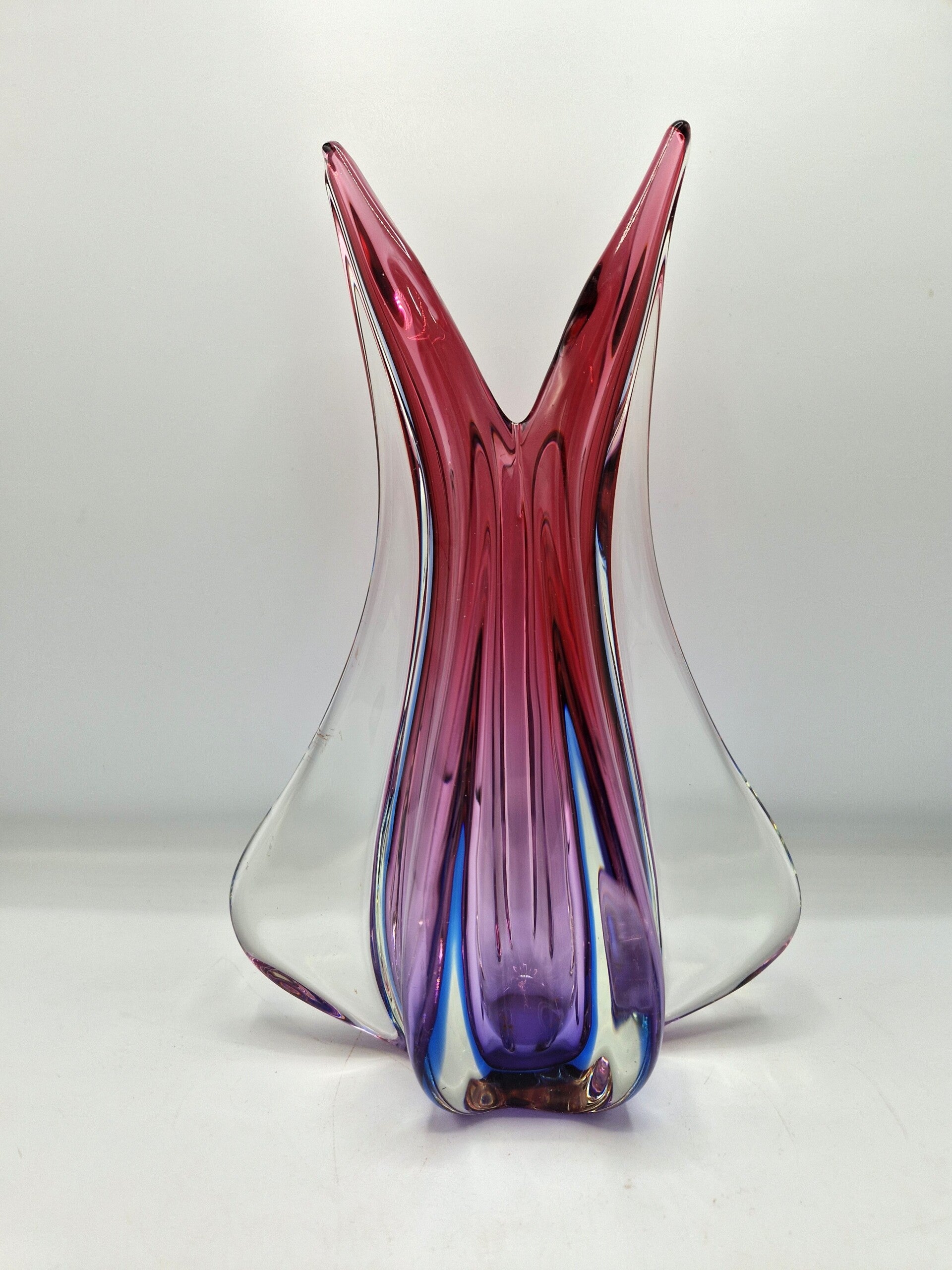 Nice big Murano glass vase from the 1960s. This pink and blue vase was made with the layered technique called sommerso. Great vintage condition without chips, wear consistent with age (superficial scratches).