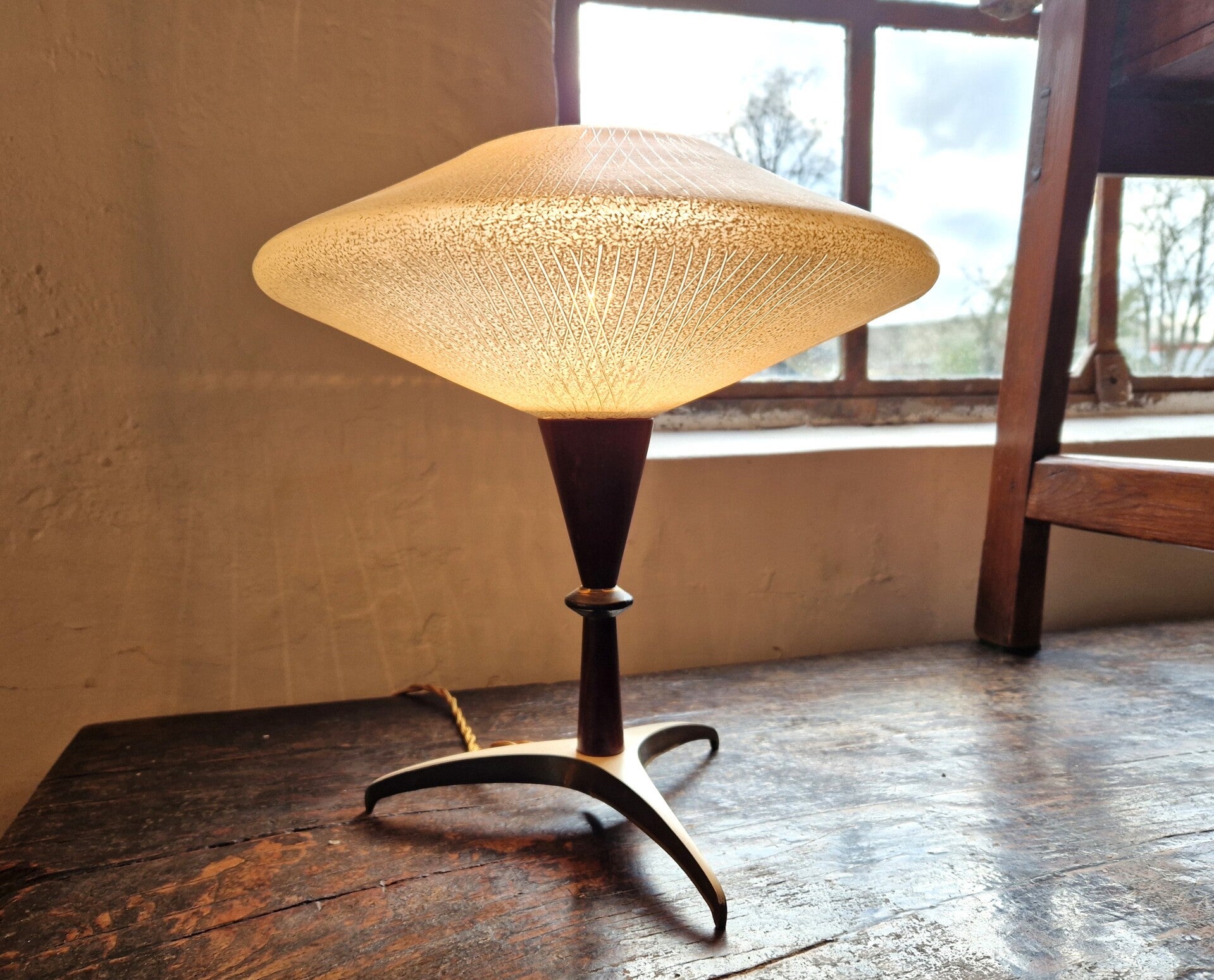 Teak, Glass and Brass, this tripod table light has got it all. Made by Massive inthe 1950s and very much in the atomic or space age style of the time. The lamp is in great vintage condition. The brass is unpolished so a bit dark here and there. Rewired and ready to shine!