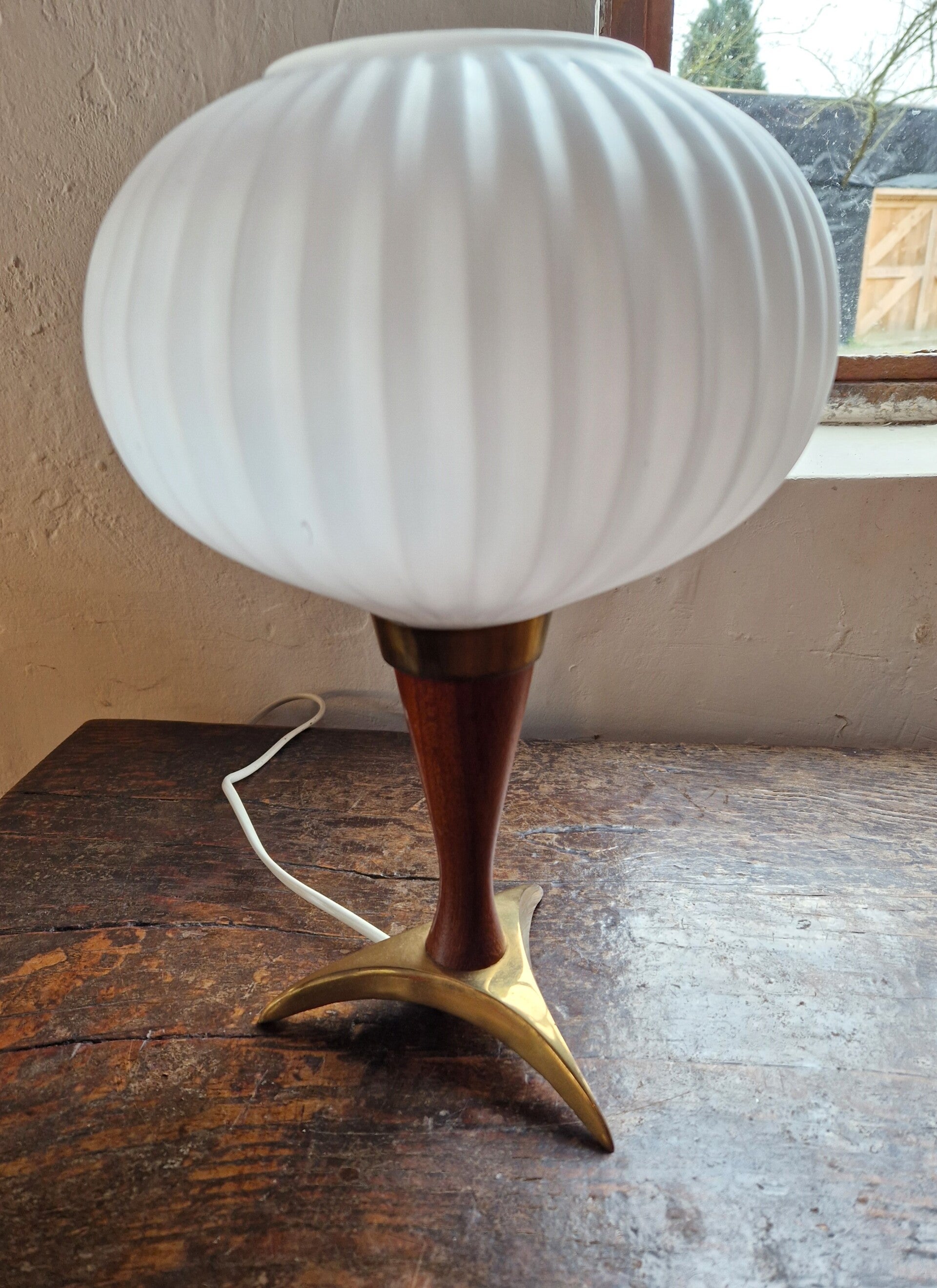 Atomic Teak and Opaline Glass tripod Table Light, 1950s
