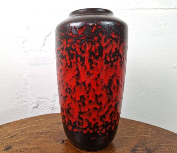 Really handsome floor vase by Scheurich, made in Germany in the 1970s. The fat lava glazing is a striking red on a deep bronzy brown base color. Great condition.