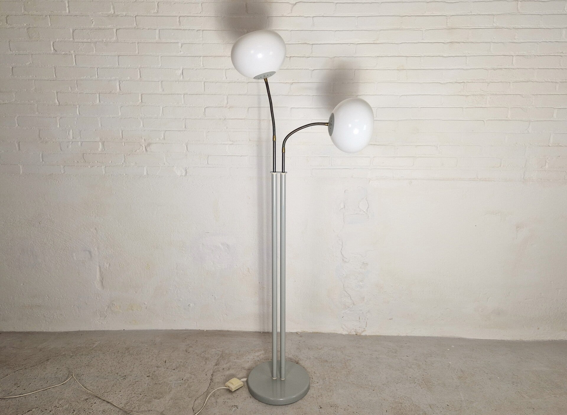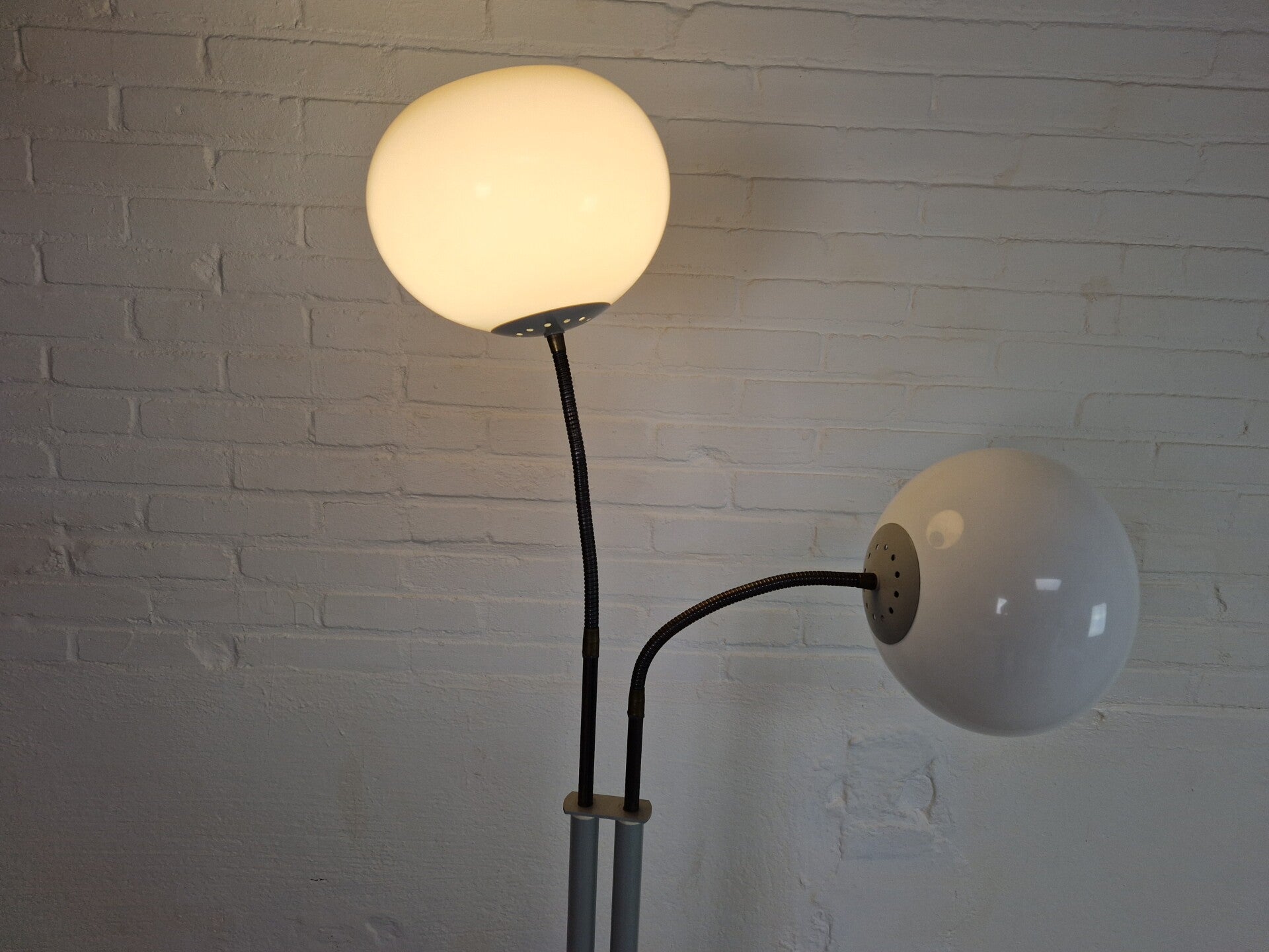 Great piece of Dutch design. This Herda floor lamp has two moveable arms with white plastic shades and a grey metal base. Great for living room accents or a reading light. Rare model!