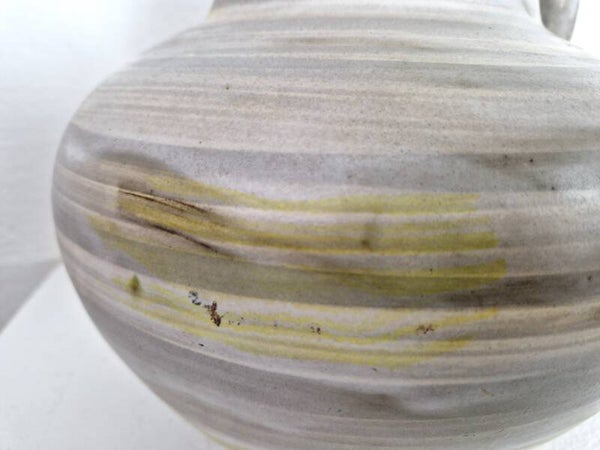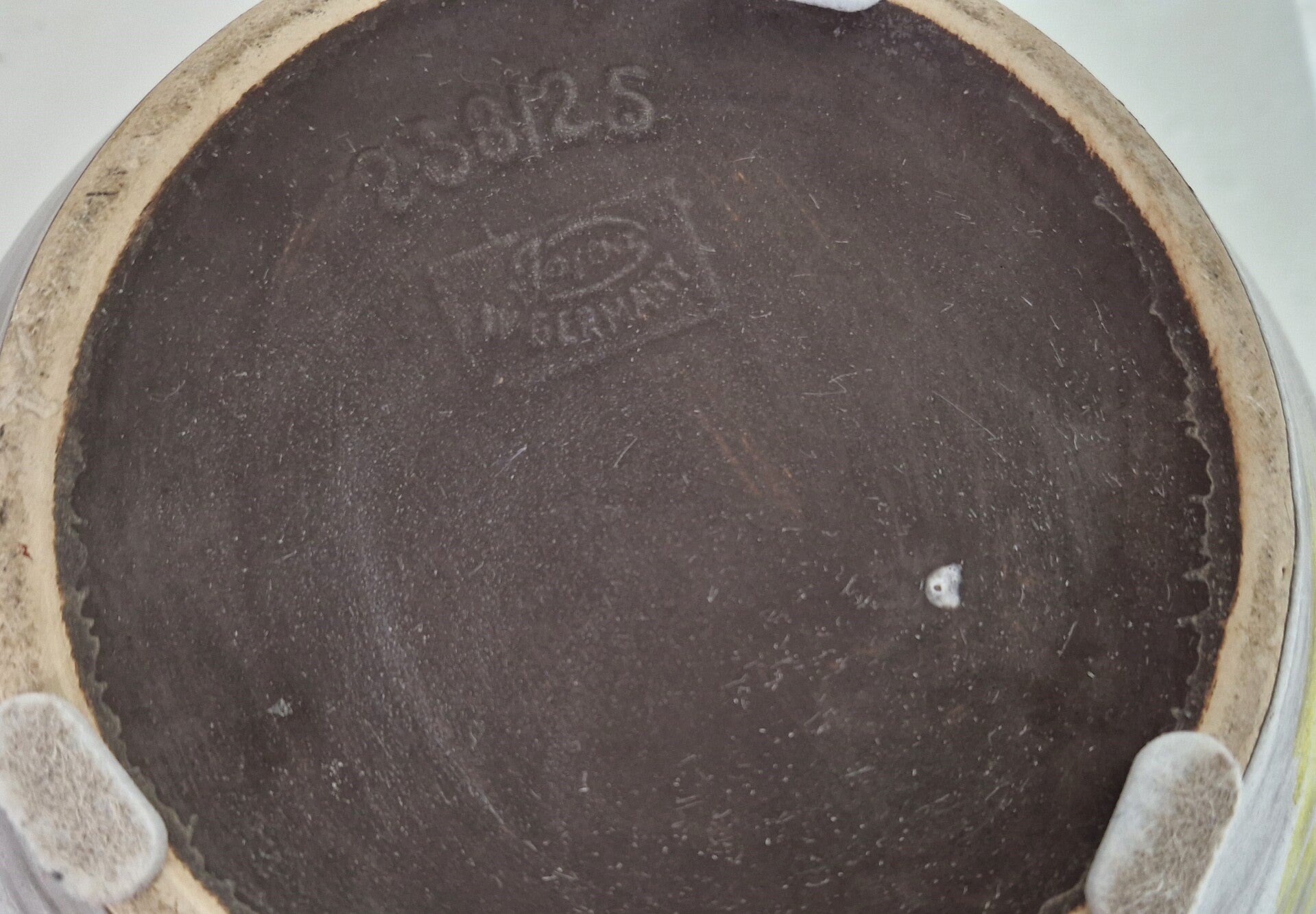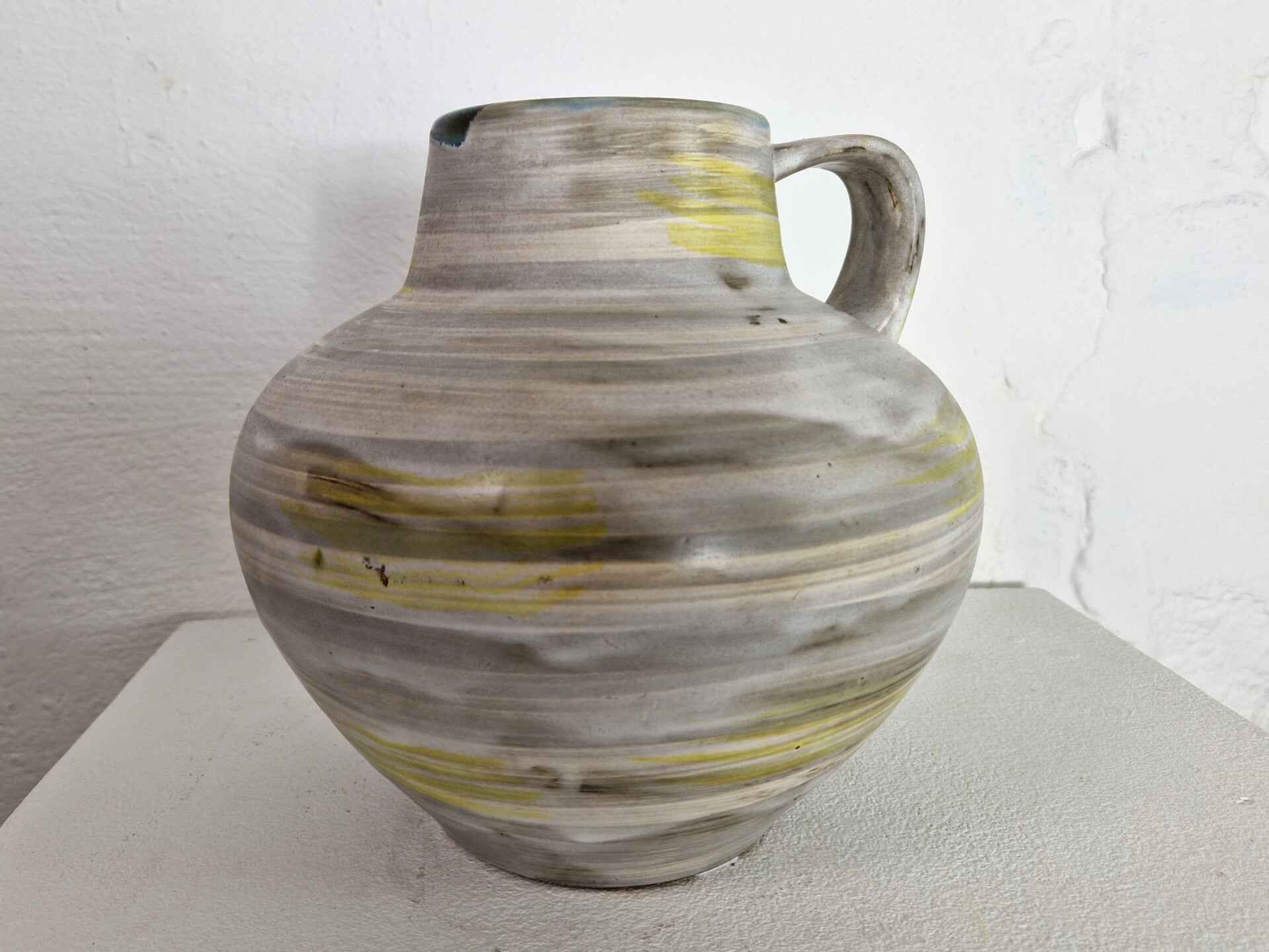 Very nice fat lava ear vase by German company Jasba with a pretty rare glaze decor, like modernist abstract painting almost. Yellow smears on grey and white and with a green rim and inside. Good vintage condition, no chips or cracks.