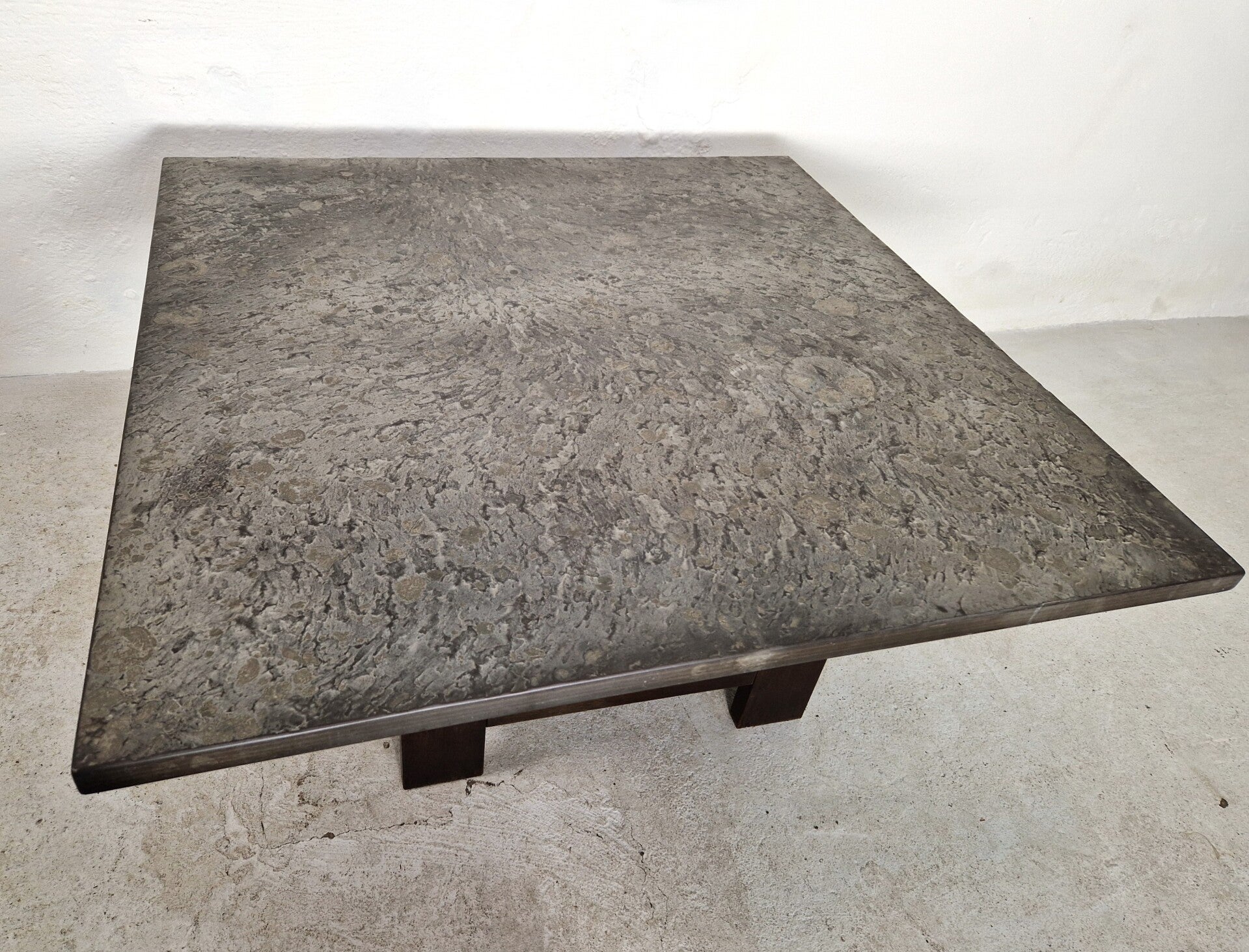 A fantastic coffee table from the early 1970s with a fossil stone top (heavy!) and a sleek wooden base. Understated chic mid-century design! Great condition, minor damage to a corner, but we polished it and it is barely visible or noticeable.