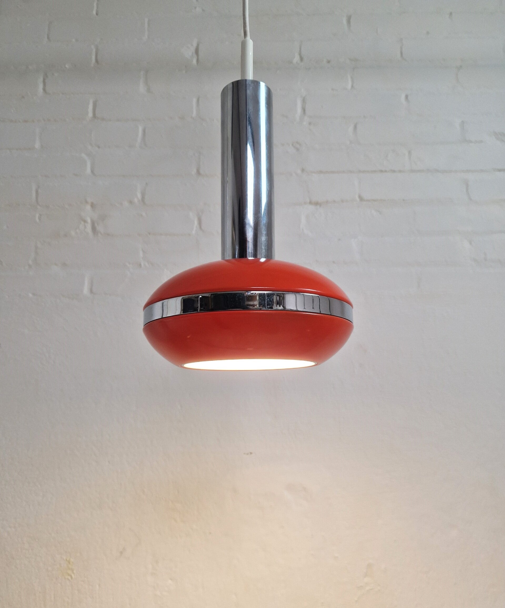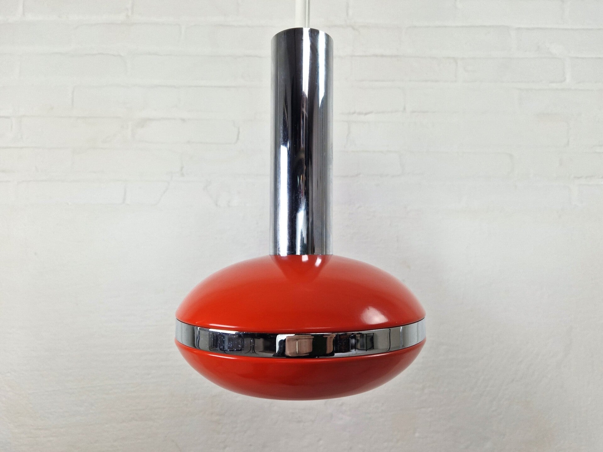 This UFO pendant lamp by Sölken Leuchten has been hanging in a German lamp shop since the 1960s and was never sold. So this is a true new old stock piece! Great chrome and orange color with a white inside of the shade that reflects the licht downwards. Space age icon!