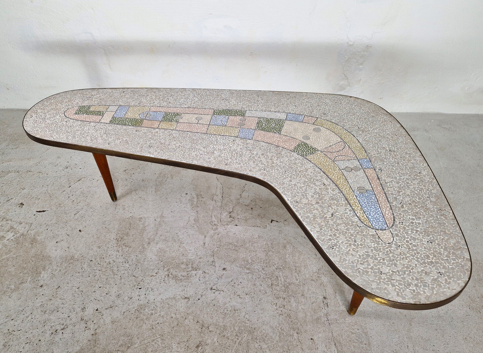 One of a kind 1960s triangle shaped mosaic coffee table by Berthold Müller-Oerlinghausen (1893 – 1979). Famous for his amazing mosaic inlayed coffee tables, this is an extra large version, with a boomerang shaped body with a brass rim, teak legs with brass feet. The mosaic has a grey base tile with pastel blue, pink and greens. Great vintage condition. We only did some minor touch ups of the cement around the side.