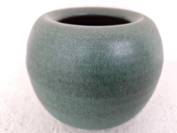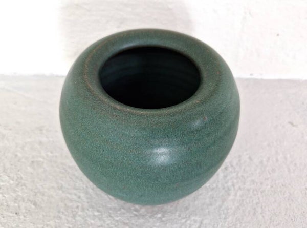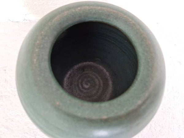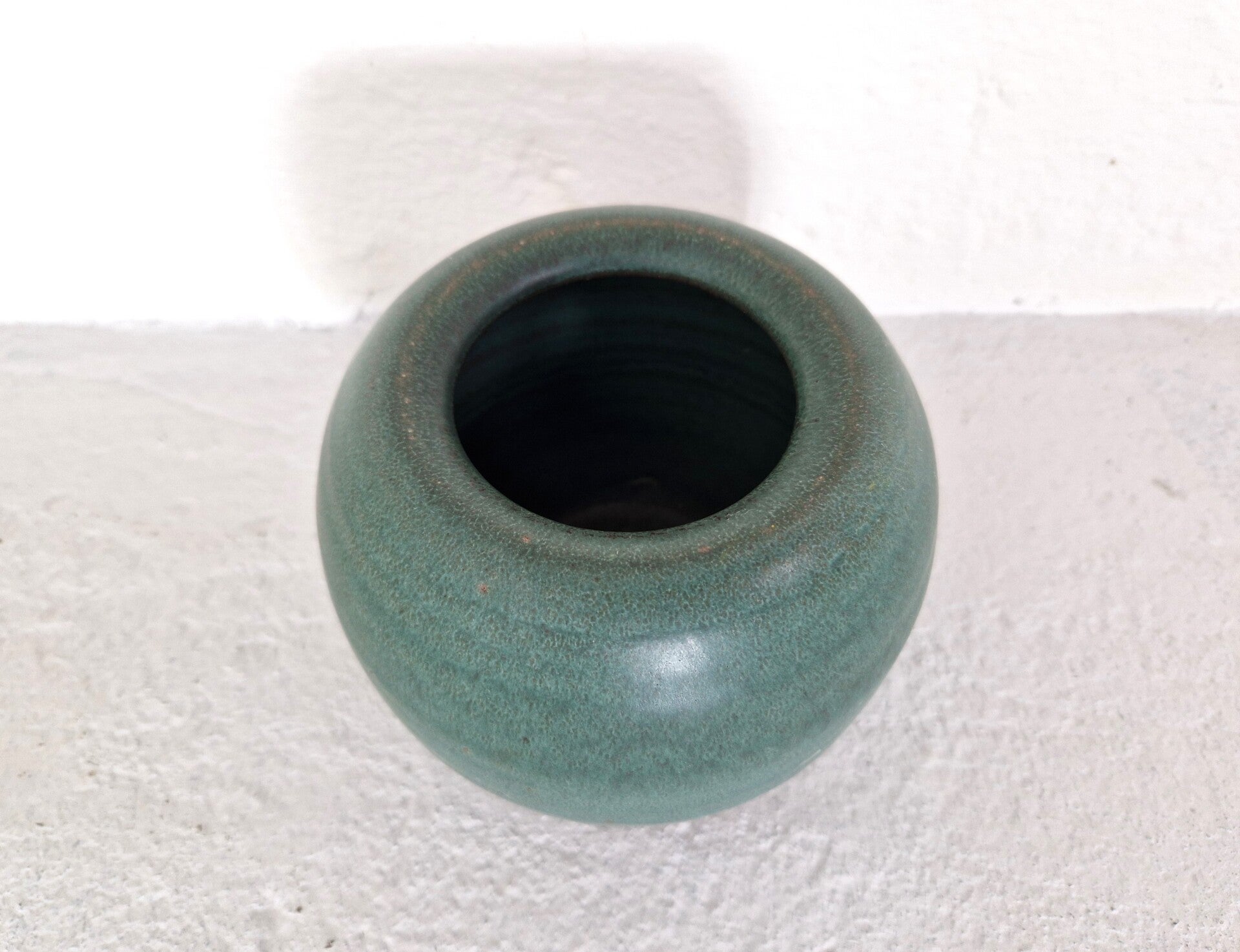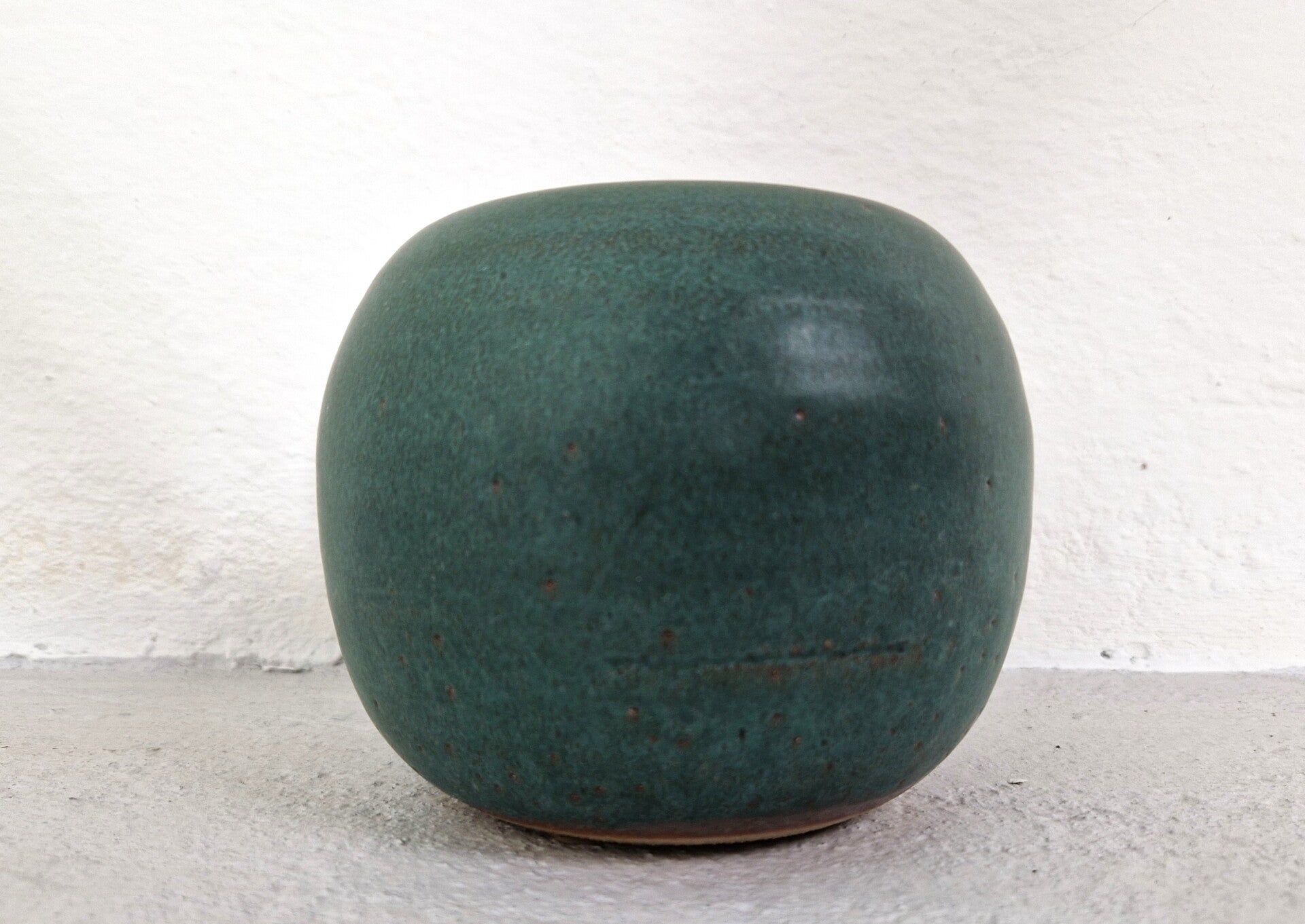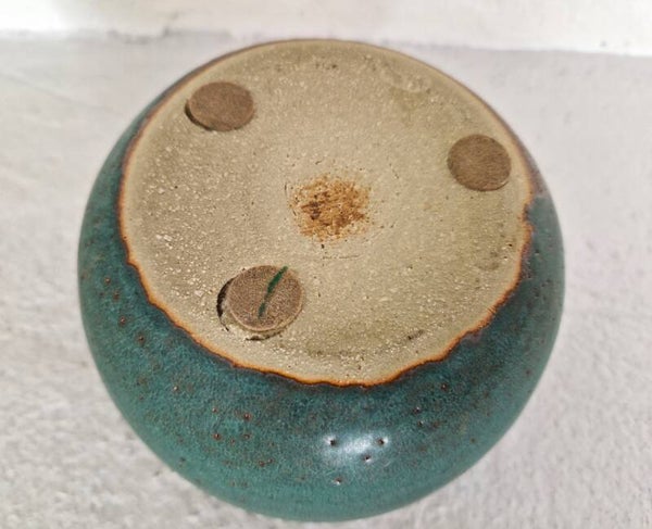This is a pretty little (unmarked) vase by Gubbels Helden, a well known Dutch Pottery. The vase has a very modern and suble glaze with diffrent shades of green on a brown base glaze. Great condition.