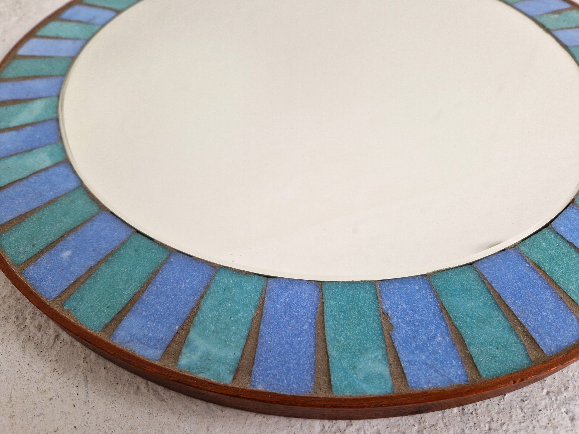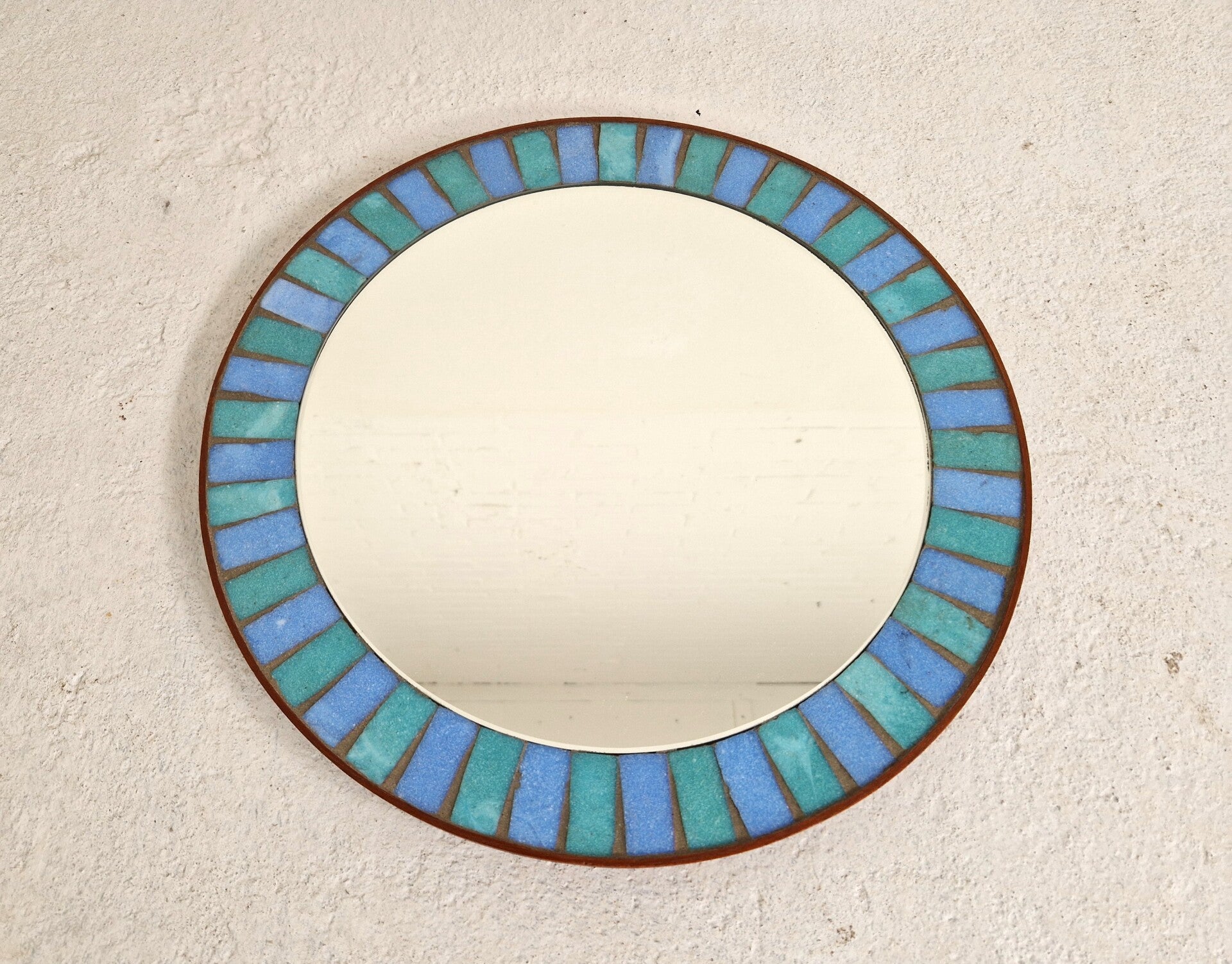 For people that like a bit of color around their mirror. This mosaic mirror has glass pieces in green and blue and is also nicely finished with a teak rim. Very nice vintage mediterranean feel. Great vintage condition.