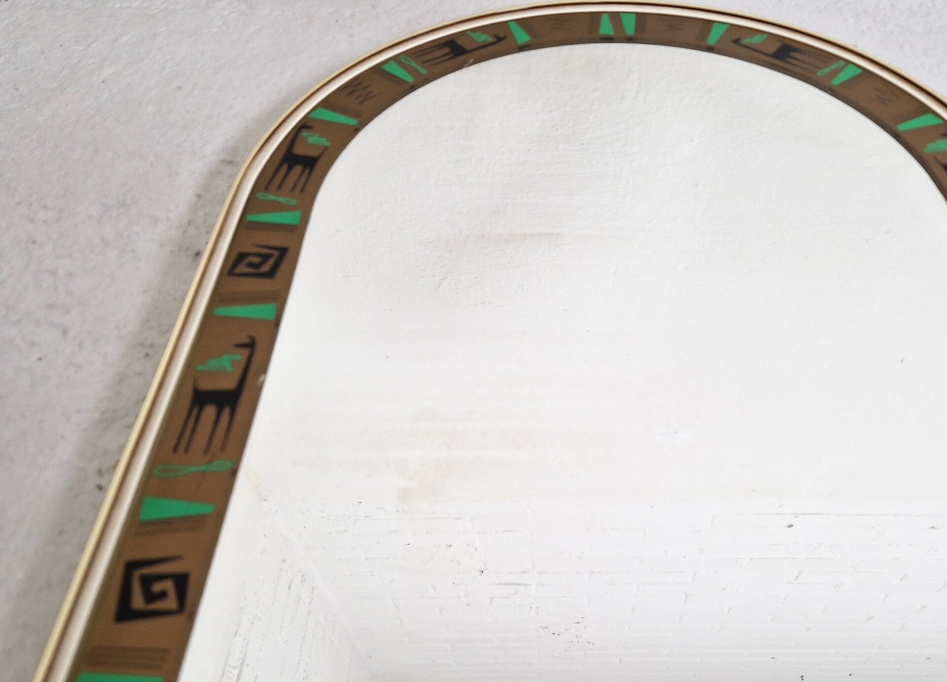 1960s Belgian mirror with a decoration of Giraffes around the edge and a brass rim. Great piece for a childrens room or hallway. Good vintage condition, some minor weathering in the glass.