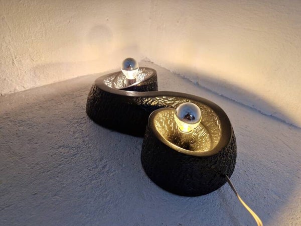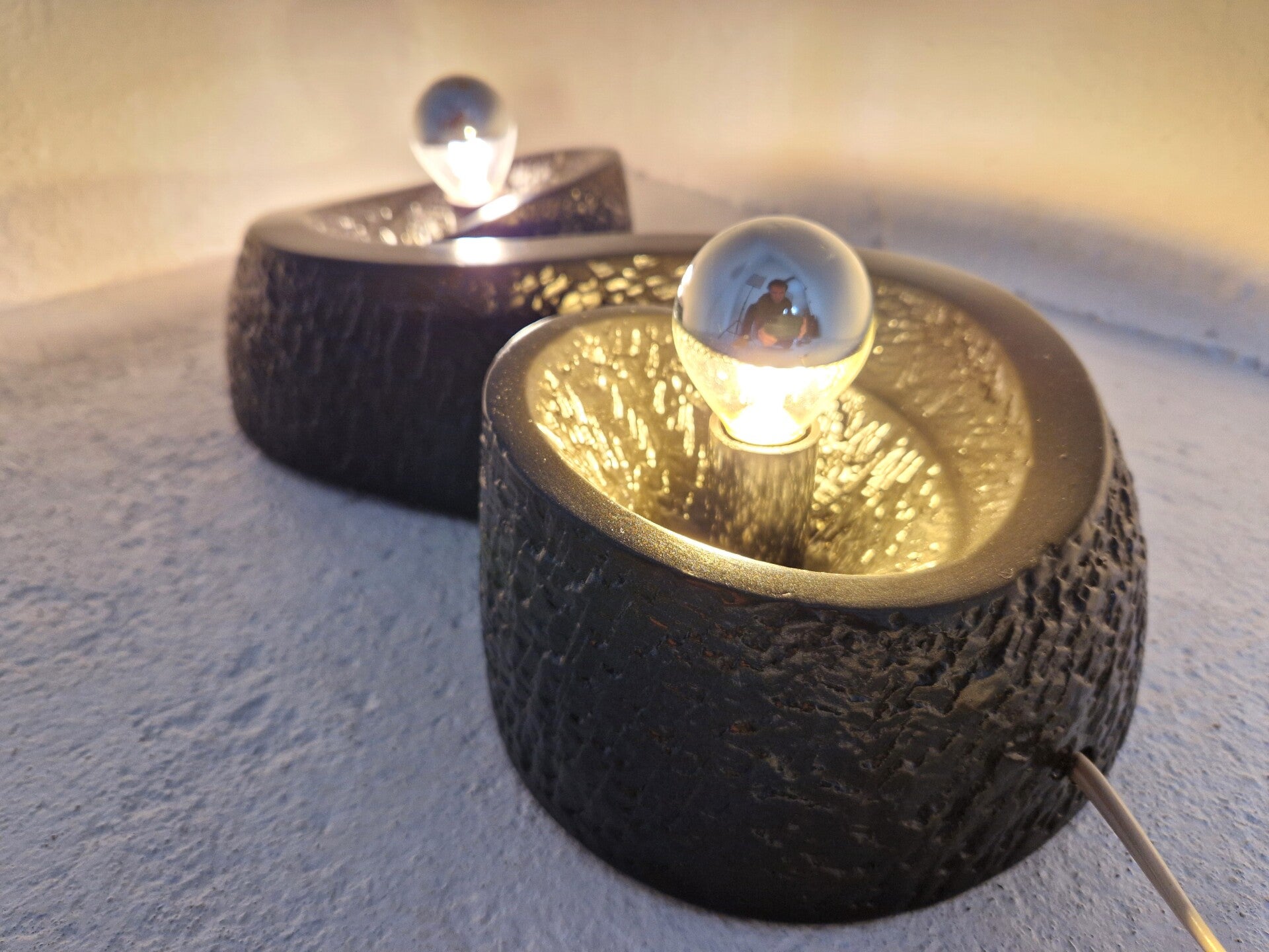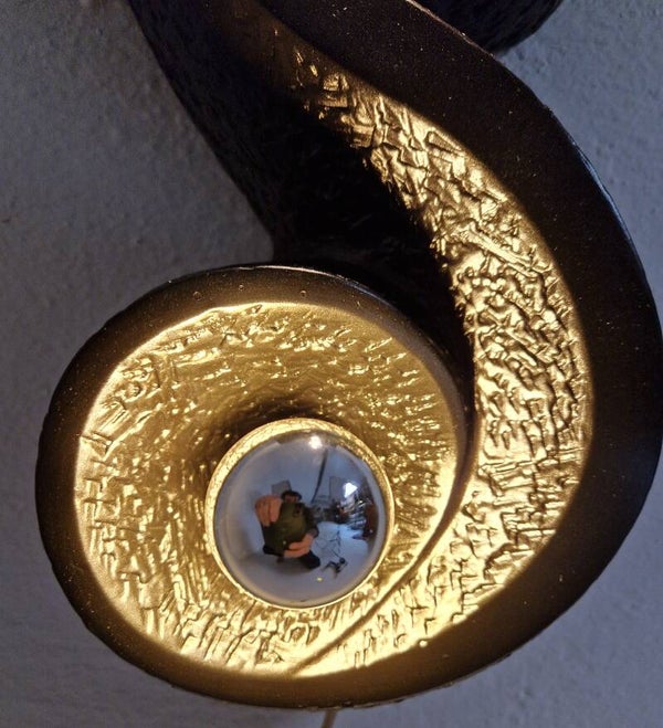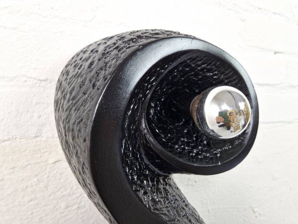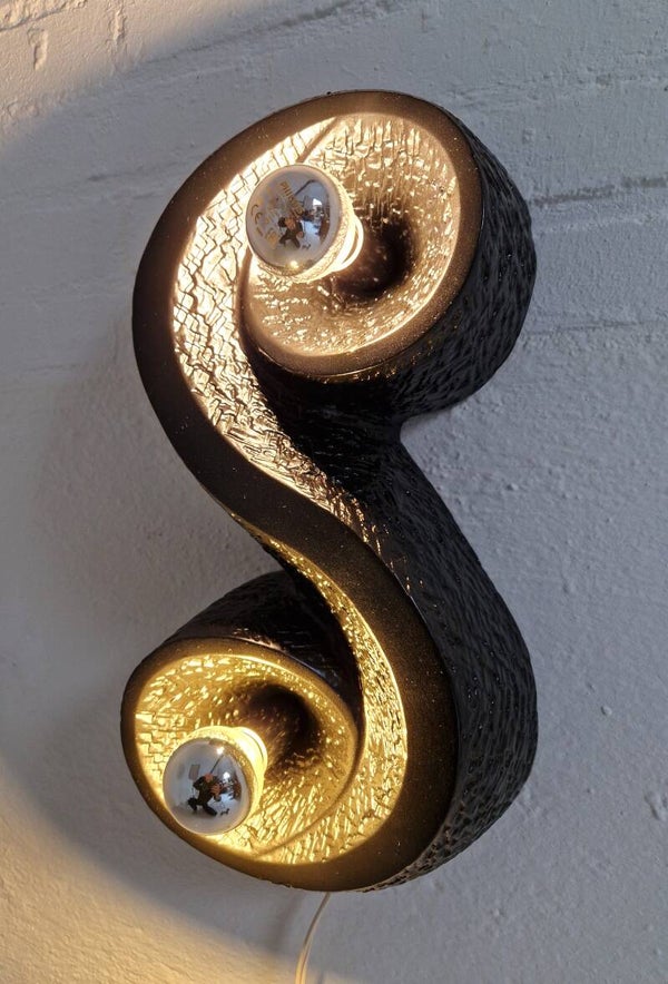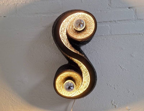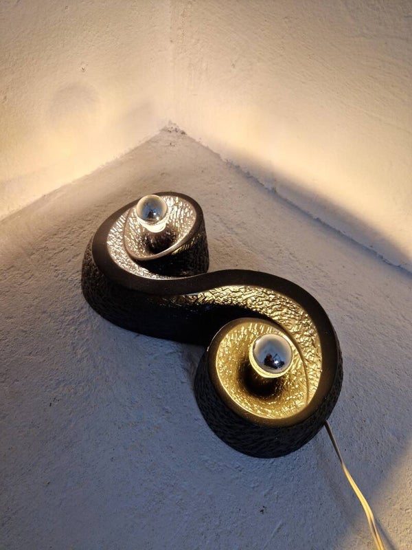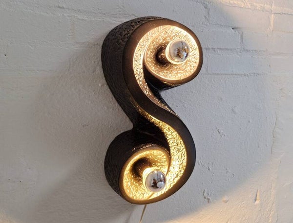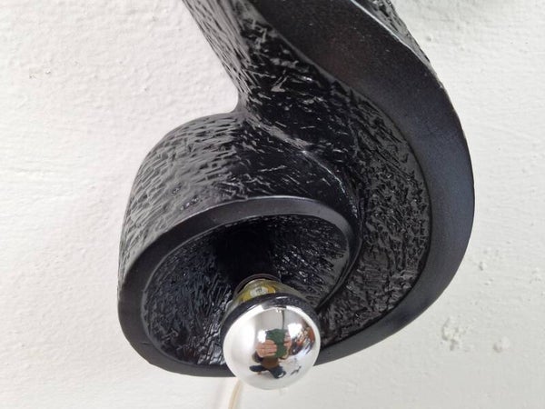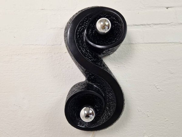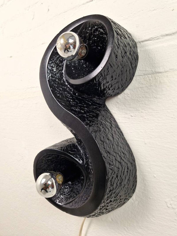 This space age ceramic wall or table light was made in the 1970s in The Netherlands or Germany and uses two lightbulbs. You can choose your own choice of bulb to complement your style of interior. In the pictures we used a warmer (yellow) and a colder (white) mirror bulb. Great vintage condition, but we completely resprayed the lamp in black paint as the old paint had some minor flakes. See photos.