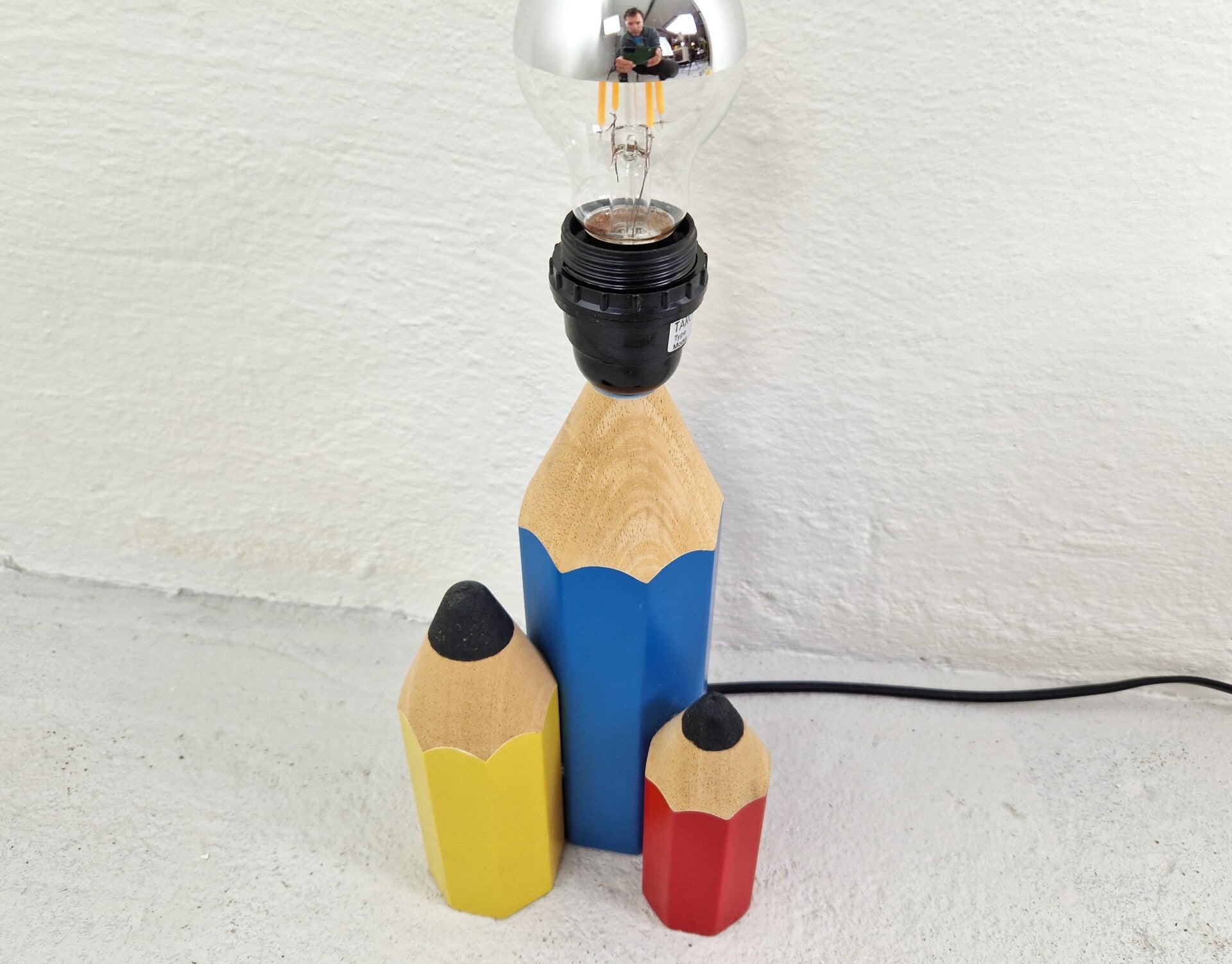 Great pop art lamp in the shape of a yellow, blue and red pencil. Made by Tarogo in the late 1980s and still in good condition. We ship without shade. We also have another with 1 pencil. Great for a kids bedroom.