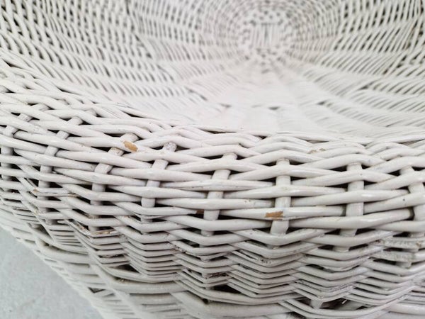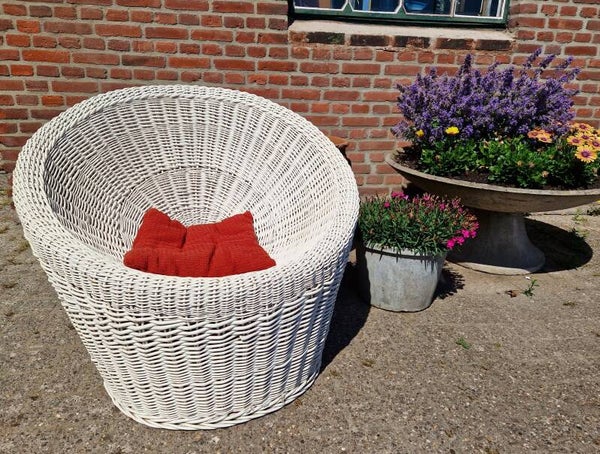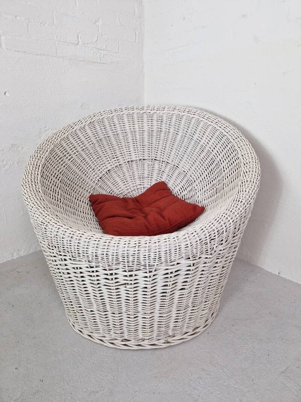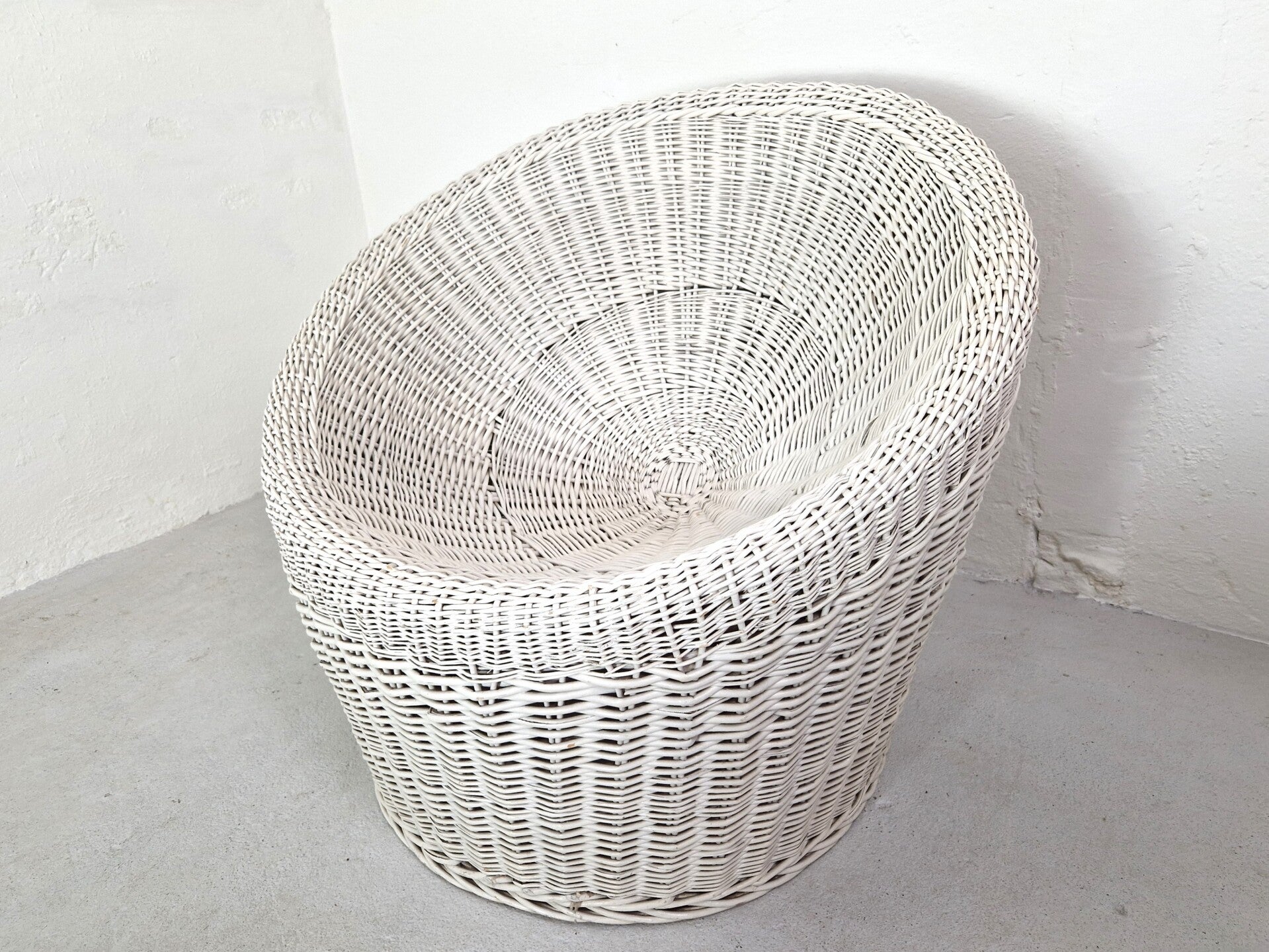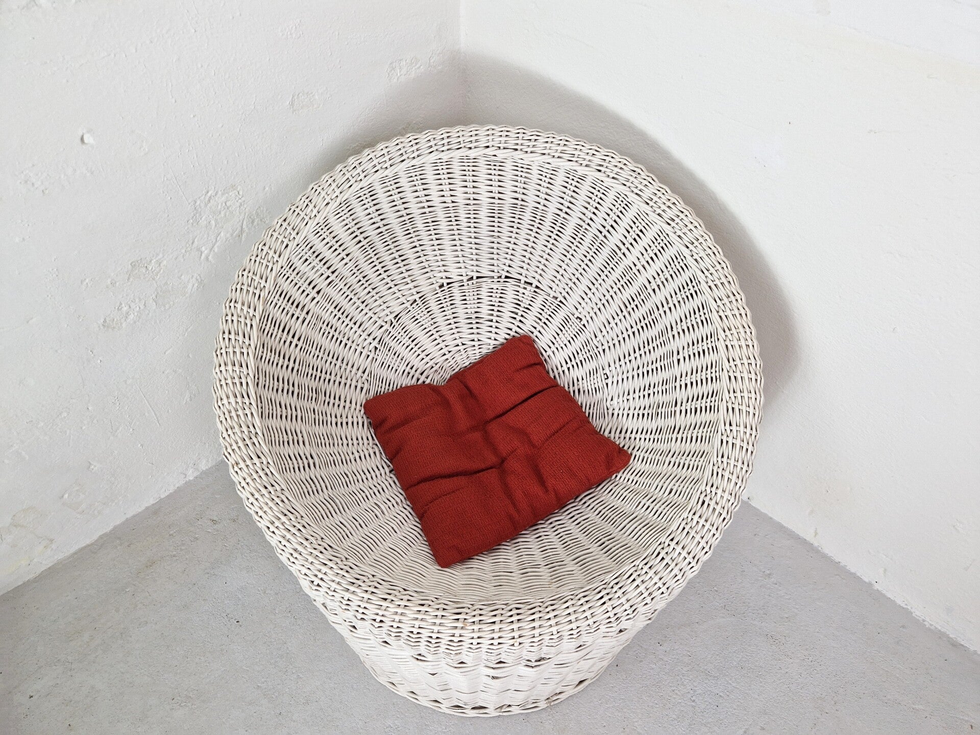 Rare 1970s pod chair made from rattan and painted white, possibly inspired by the E10 chair by Egon Eiermann. Has an early 70s space age vibe going on. Very good original condition. Comes without red pillow.
