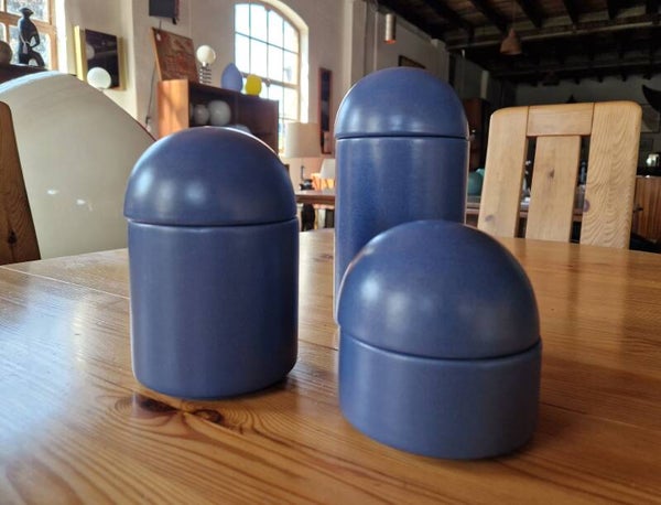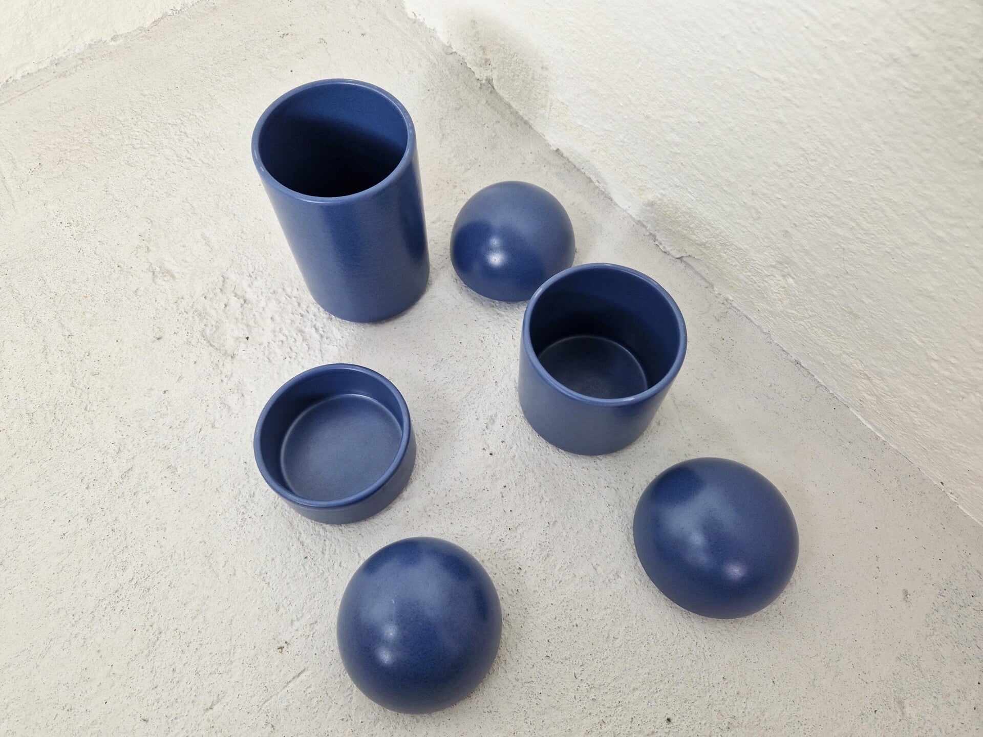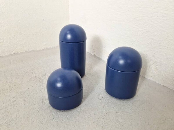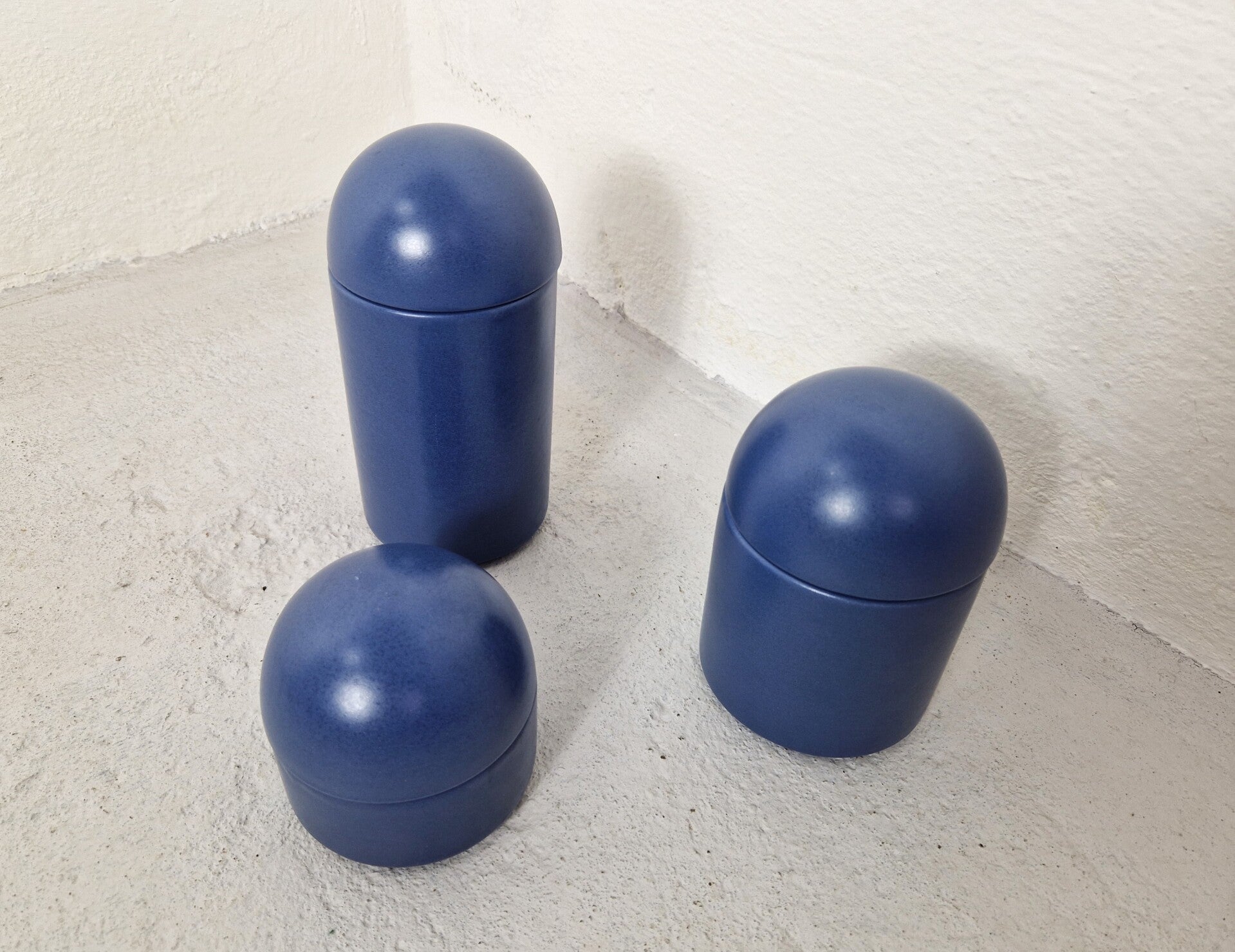 Fabulous and very rare space age set of ceramic lidded jars, designed by Pino Spagnolo for Sicart Italy. The jars are in great condition (one minor flaw on a lid, see picture), marked and with original stickers. They look great in any combination, almost like a flexible sculpture.