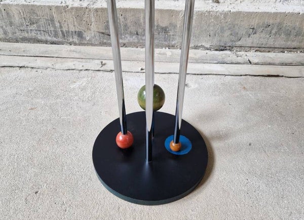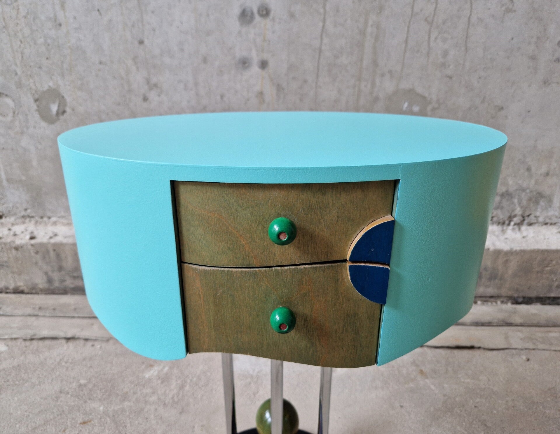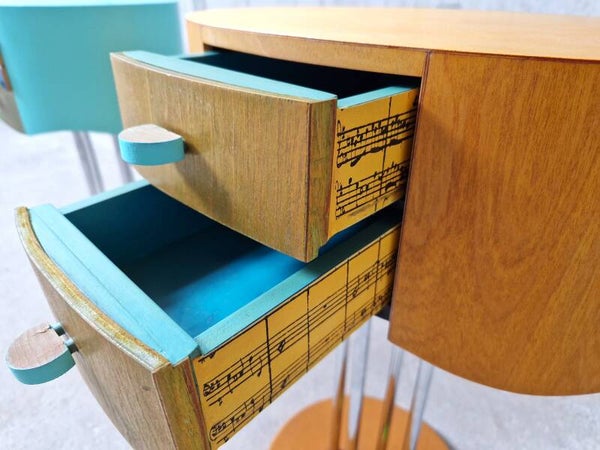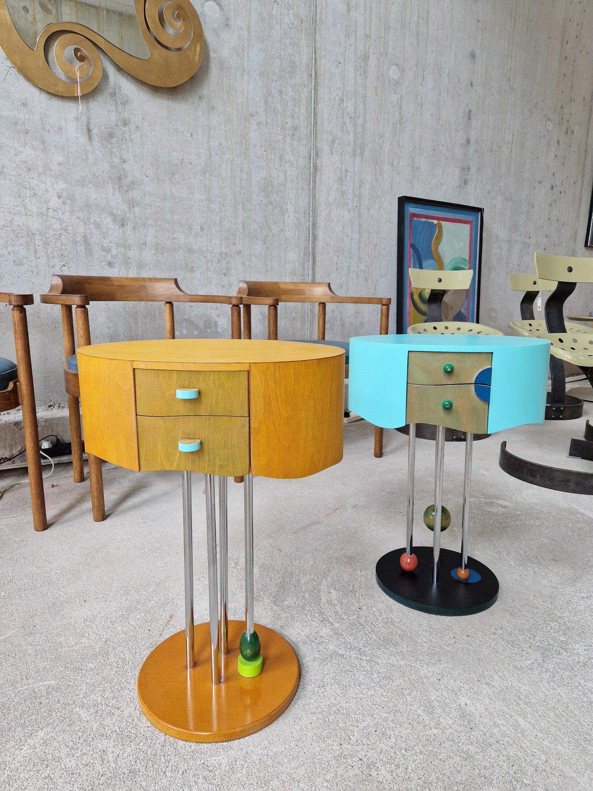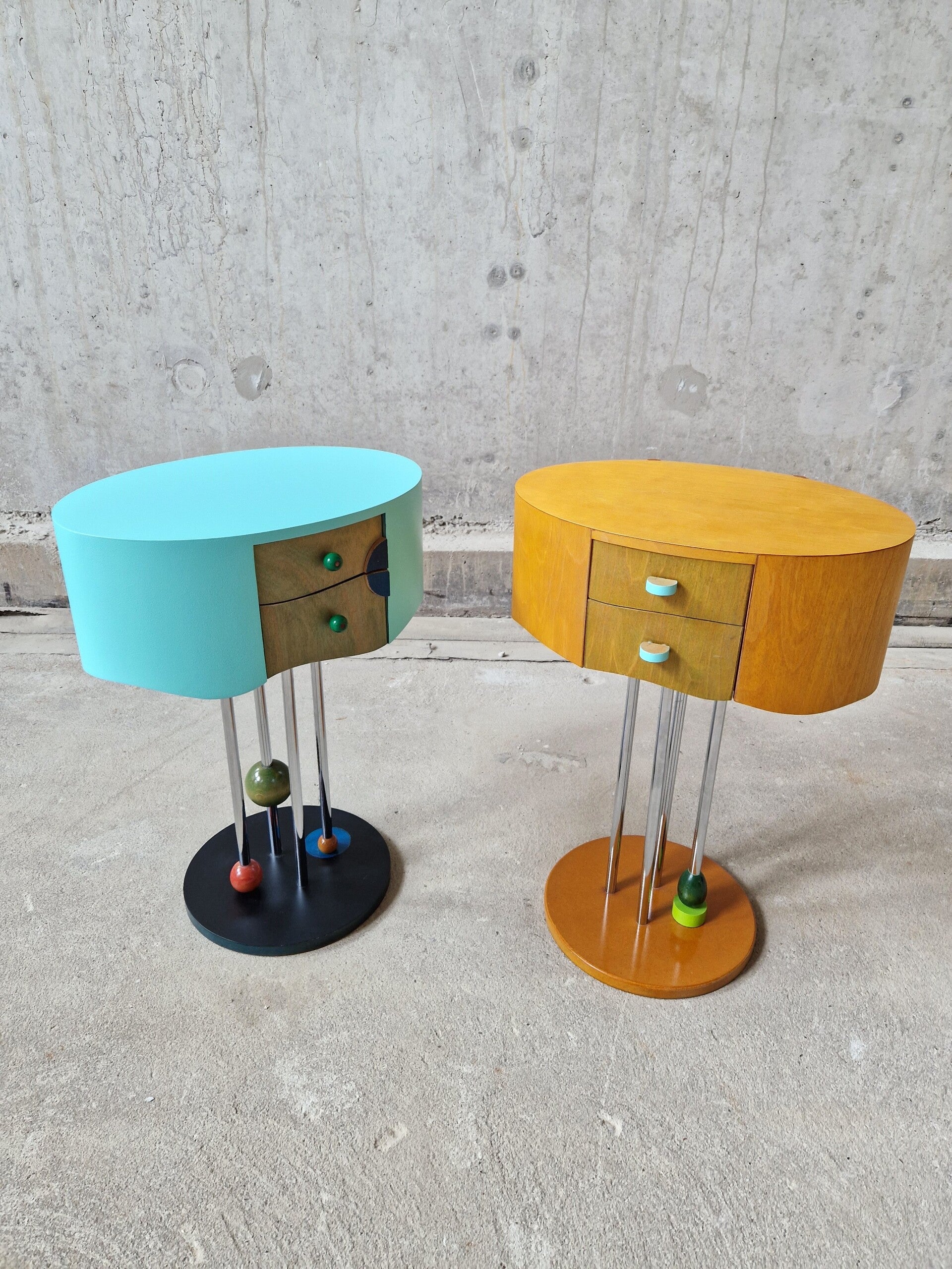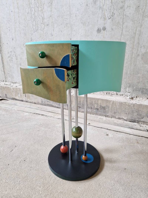 They are - although quite different in execution - a perfect pair. Postmodern and with a very big playfull nod to Memphis Milano (Group Memphis). The drawers even have little artworks on the sides, the colors and different paint and lacquers are spot on. Even the feet are super fun and well balanced in design. Find of the year!