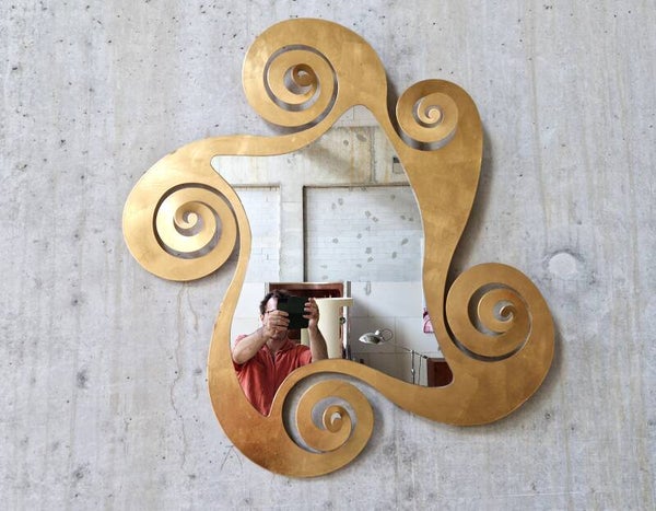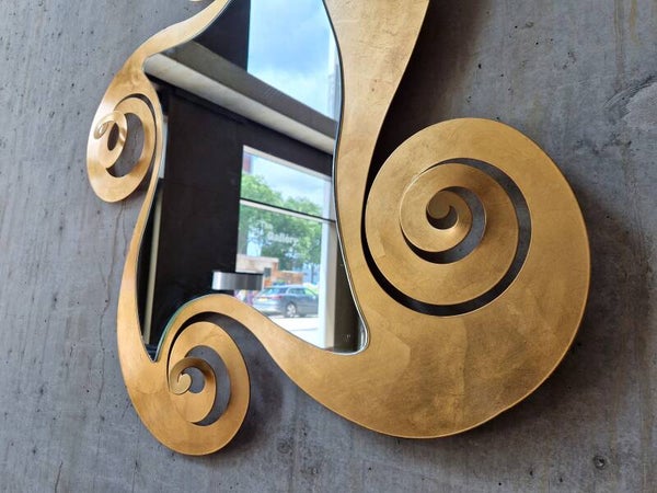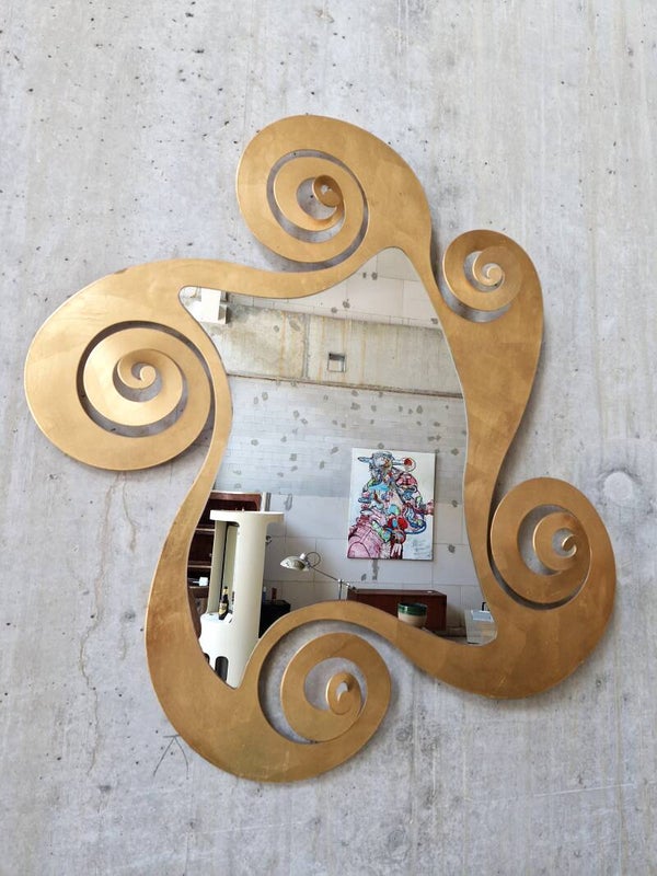 Very large gilded (on metal) mirror with decorative curls and great shapes. Made by Italian company Arti E Mestieri in the 1990s. This mirror will elevate any room with a twist of playful postmodernism and Italian chic.