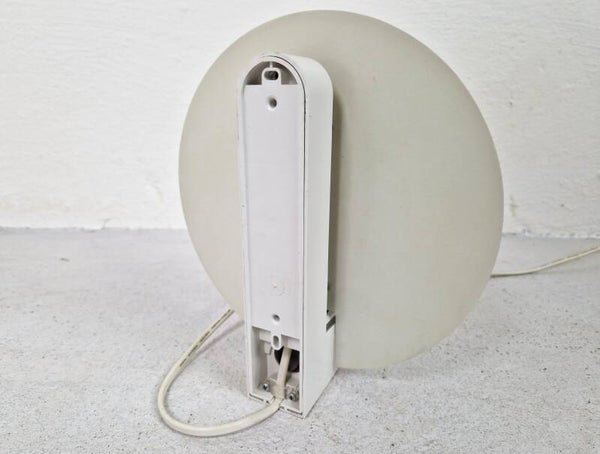 Geometric 80's wall or table lamp with 3 layers of white metal in a round shape from the Lumiance company in The Netherlands. Hence the model name 'Planeta'. The layers give the lamps a 3-dimensional effect, the light is beautifully filtered through the layers. The lamp is fitted with a PL lamp, which is included and still available new. Great condition, the discs could use a good cleaning if you want white white.