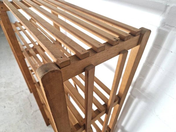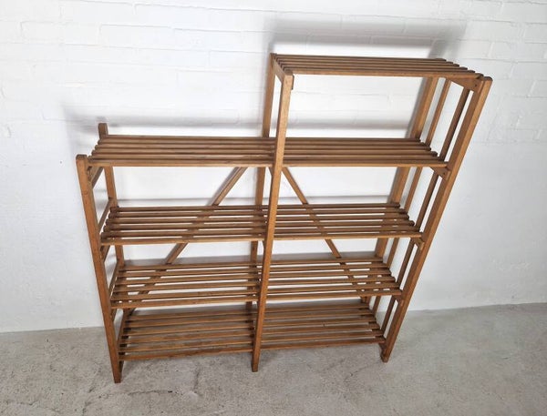Very nice and airy storage unit from the 1960s. Slatted, so great for shoes but it can hold many things. Functional in a hall or storage room or even as a little room divider with some plants. Good vintage condition, wear consistent with age.