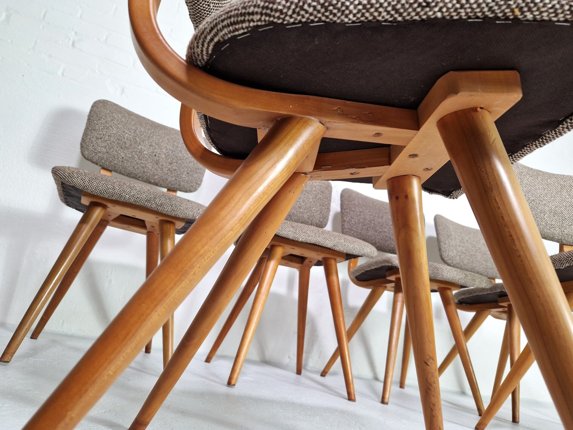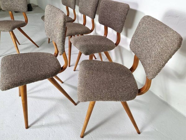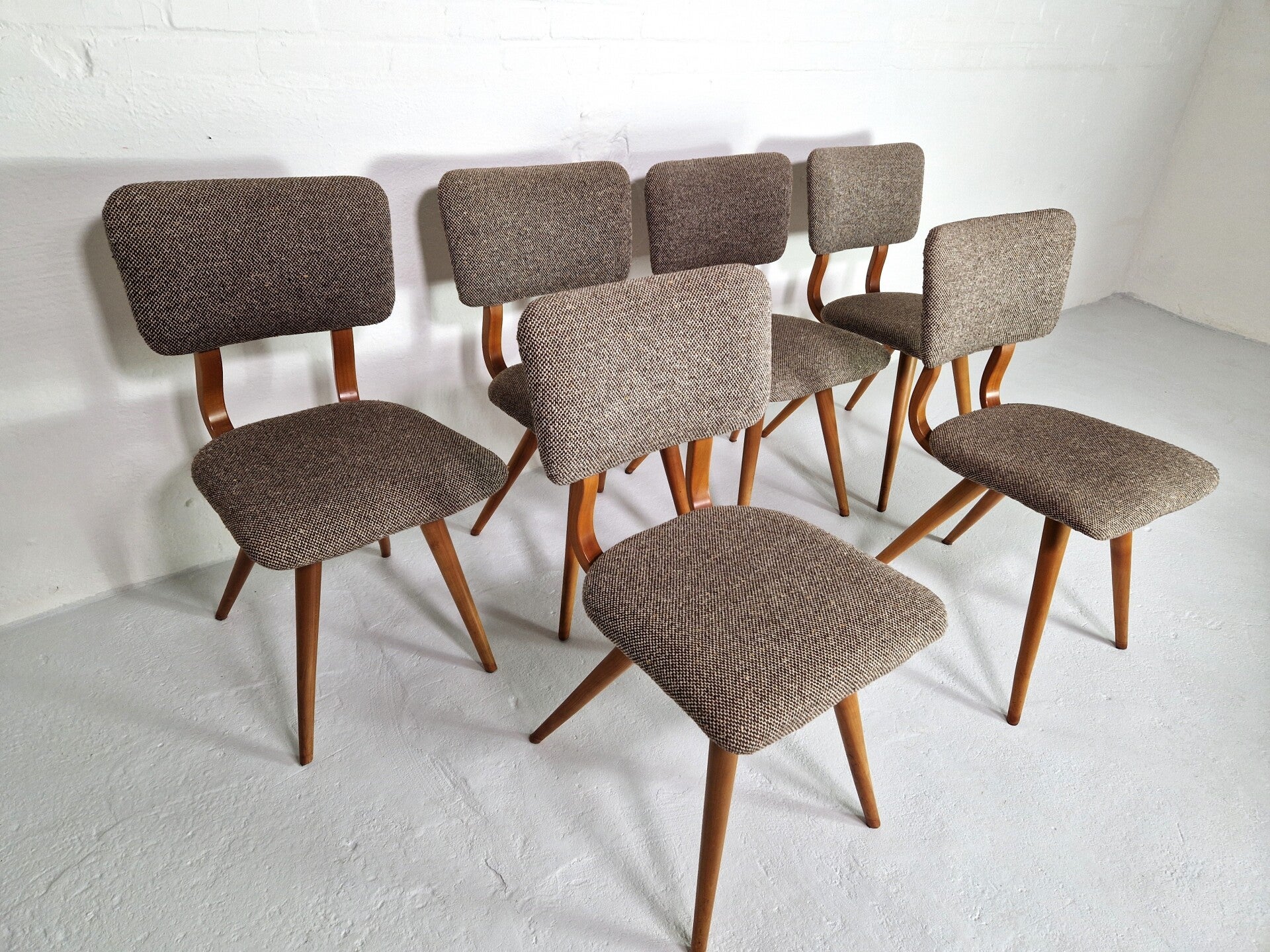 Very cool understated set of 6 vintage dining chairs with grey woolen upholstery. These are comfortable seat and probably in all original condition. Happy dining!