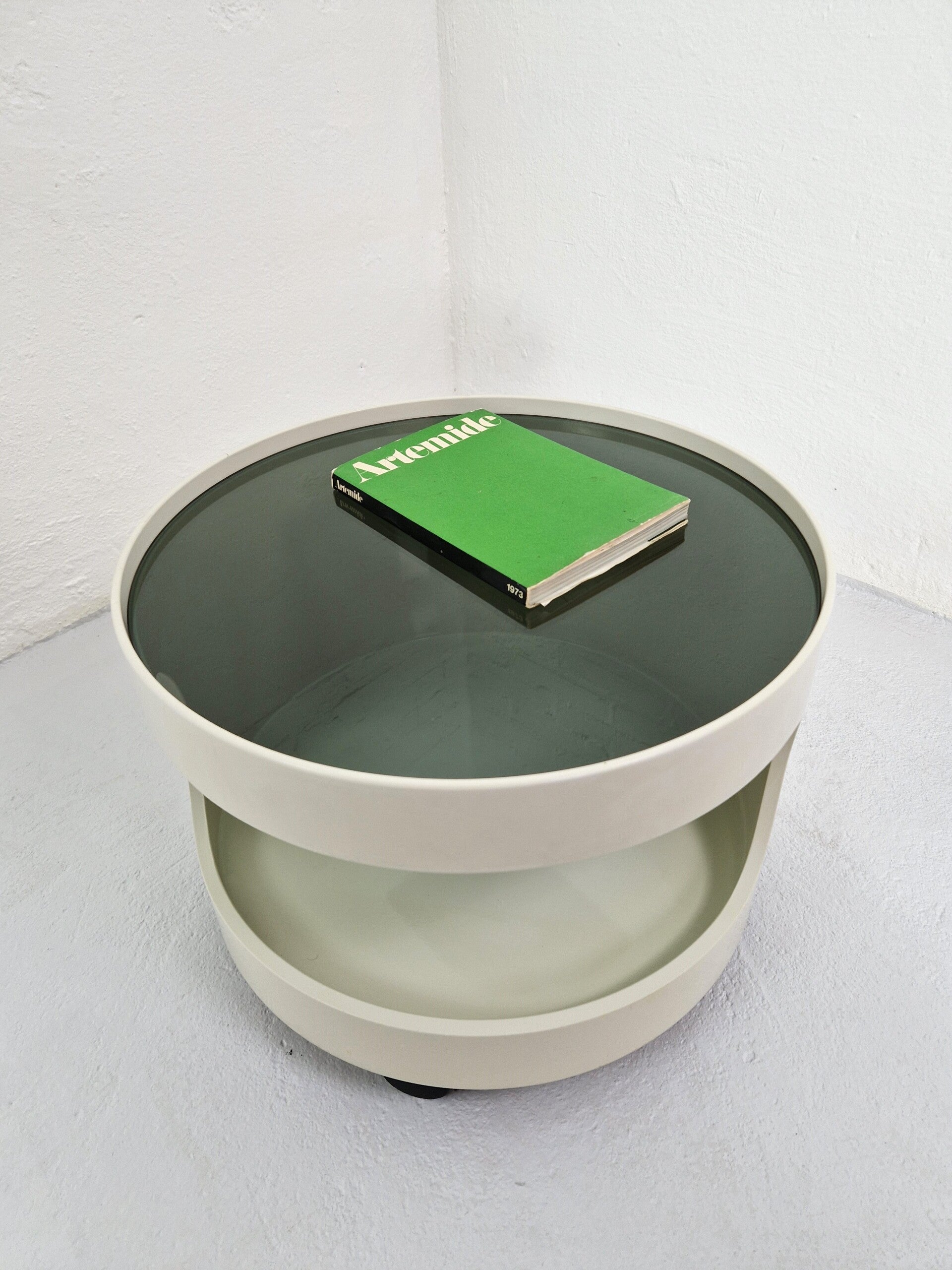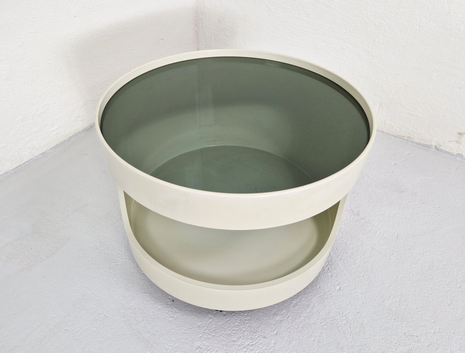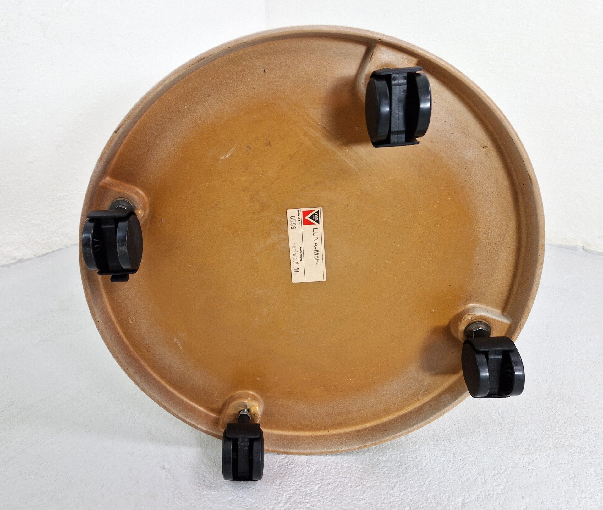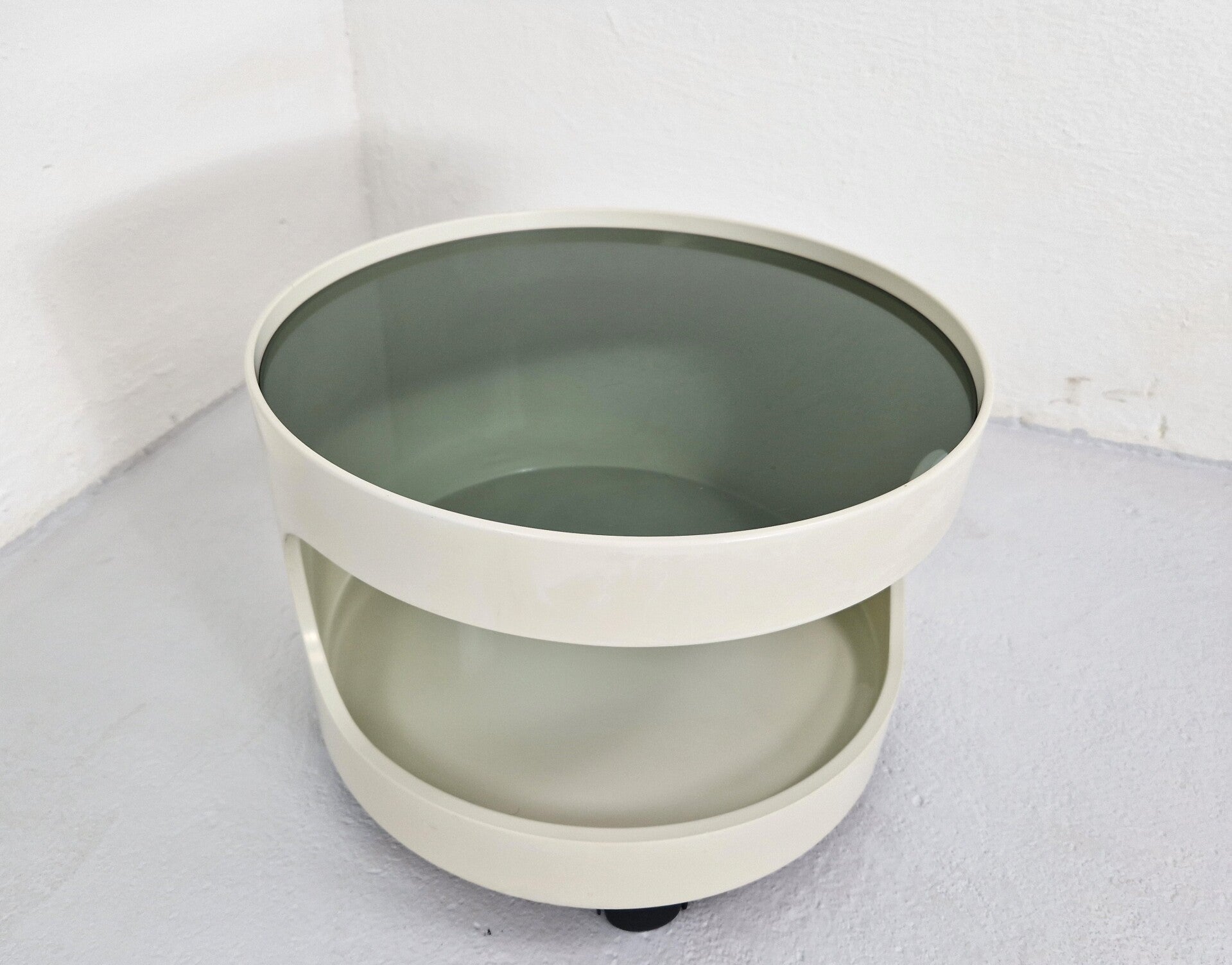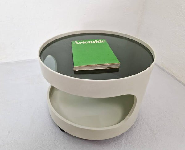 Little space age side table with a smokey glass top and a fresh set of wheels. Great design from the early 1970s and very much on trend again! Can be used with your lounger or as a nightstand.