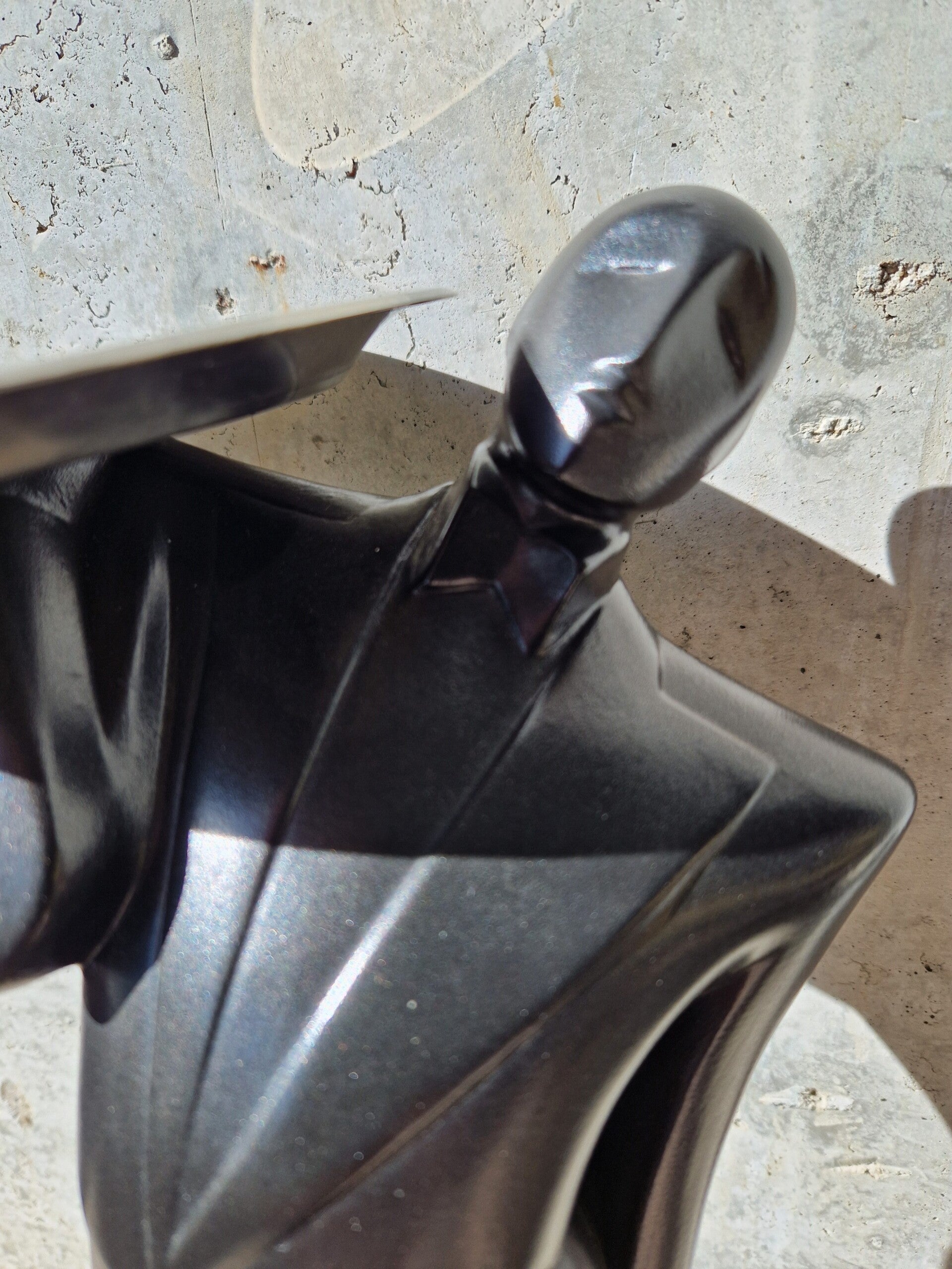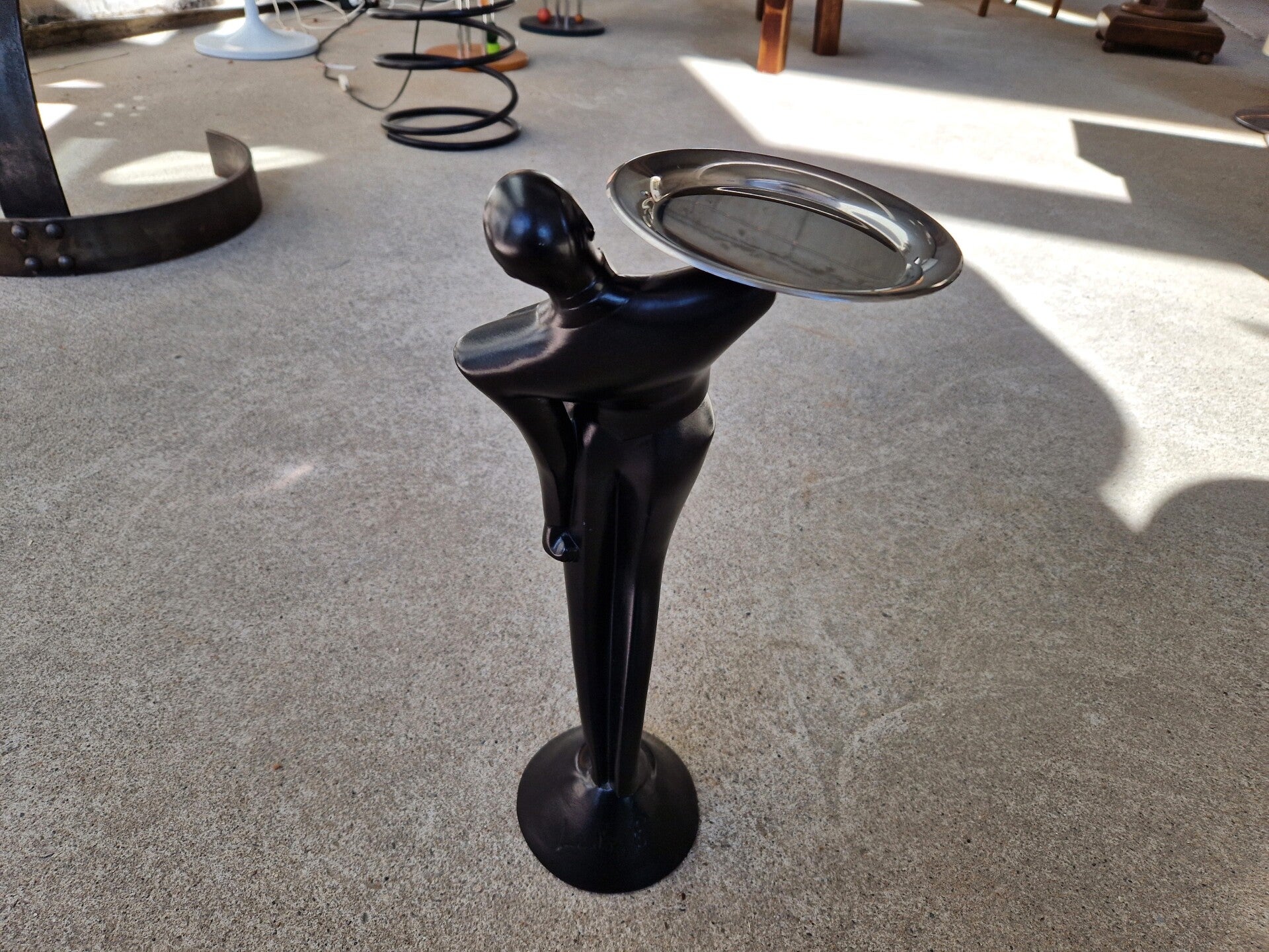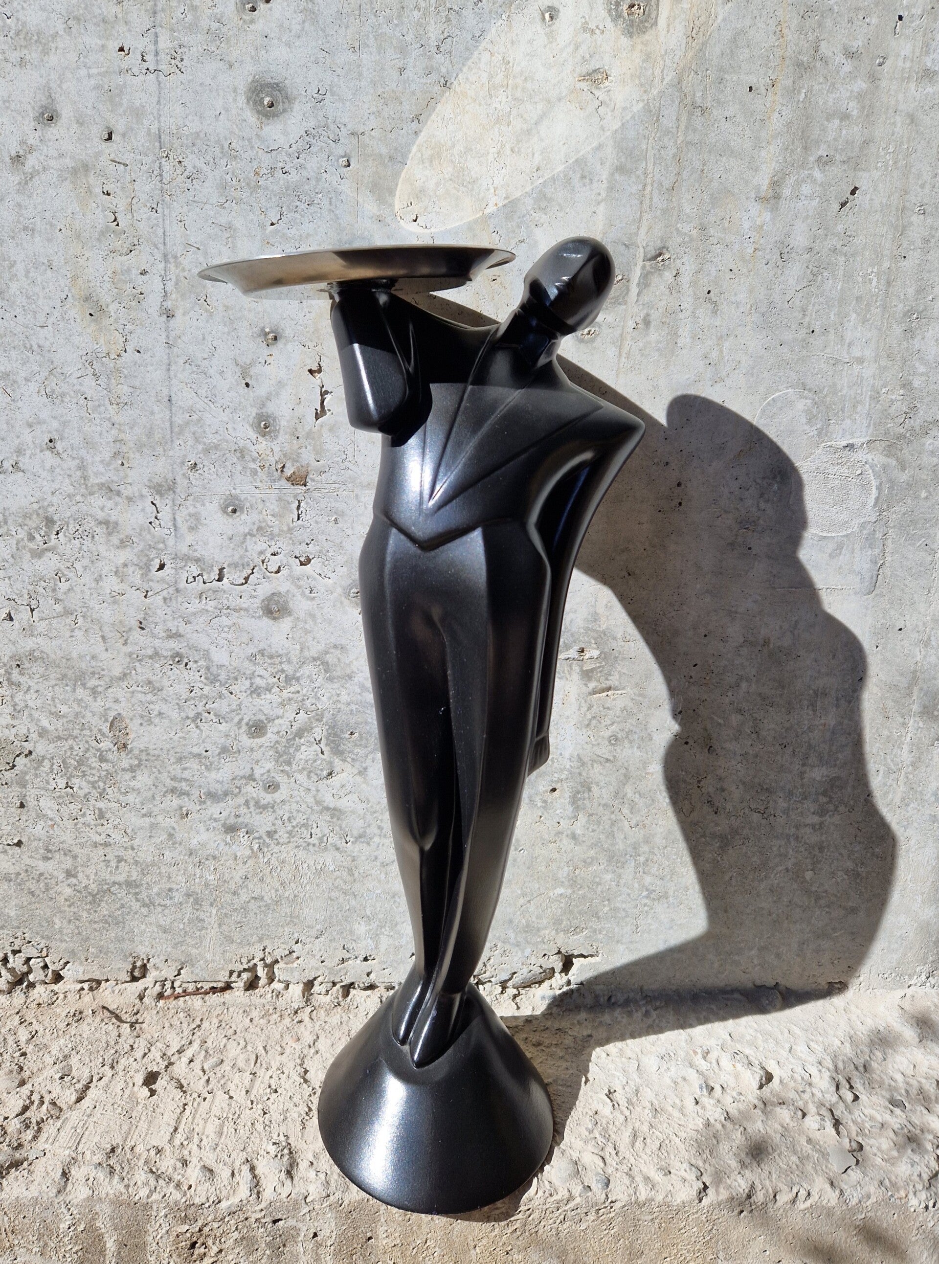 Lindsey Balkweill or Lindsey B. is a true 1980s icon hersel as she shaped the decade with her masks, plasters, figurines and more. Her typical style of sharp 1980s curves, big shoulders and some Asian influences are pure 80s art. This is her famous 'Garcon' sculpture in ceramic with a metal tray. Signed on Base.