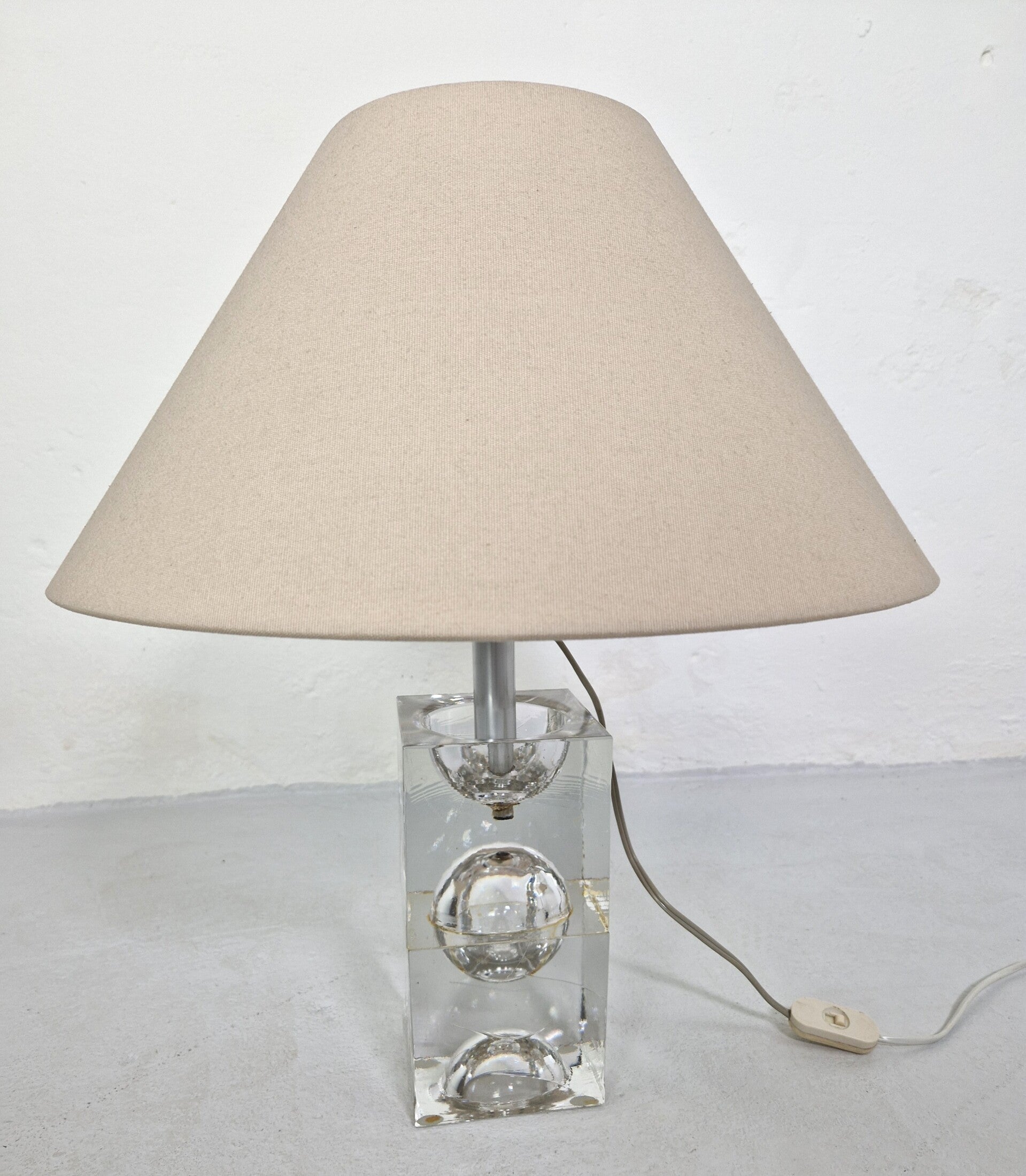Space age lamp by Dutch glass artist Floris Meydam. The lamp consists of two cubes connected with glue forming a ball in the middle. The stripes you see in picture 9 are not scratches but intential and part of the design. The lamp is in great shape, no chips.