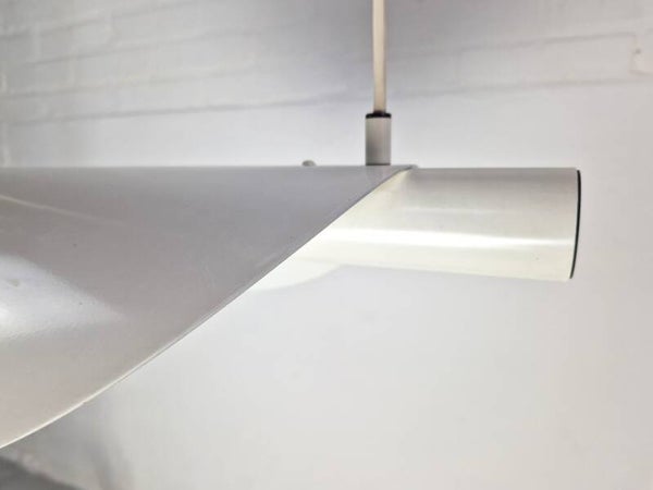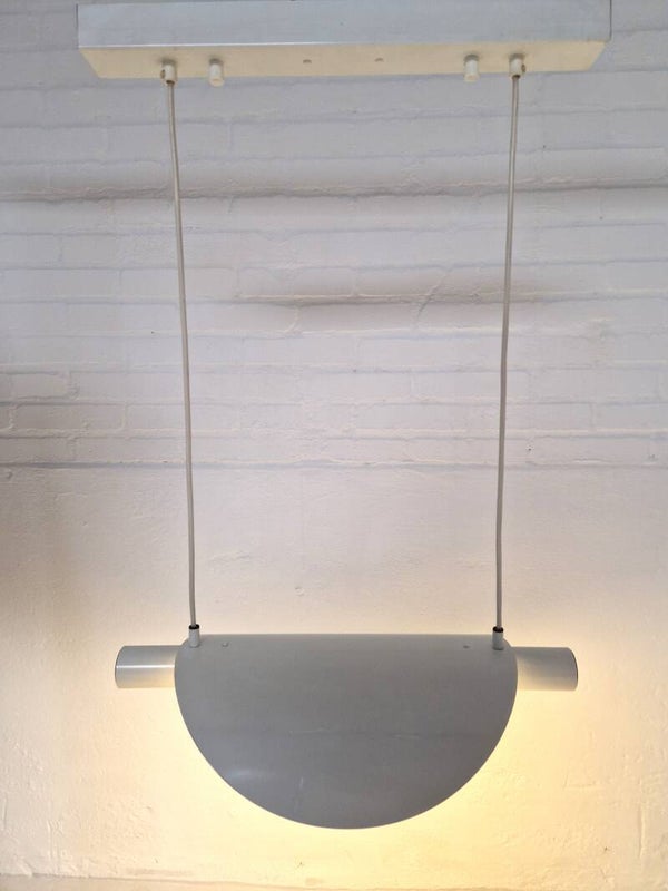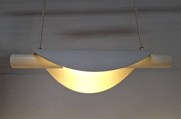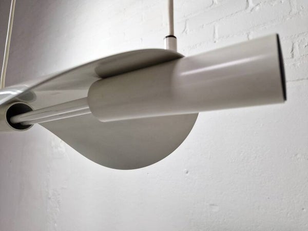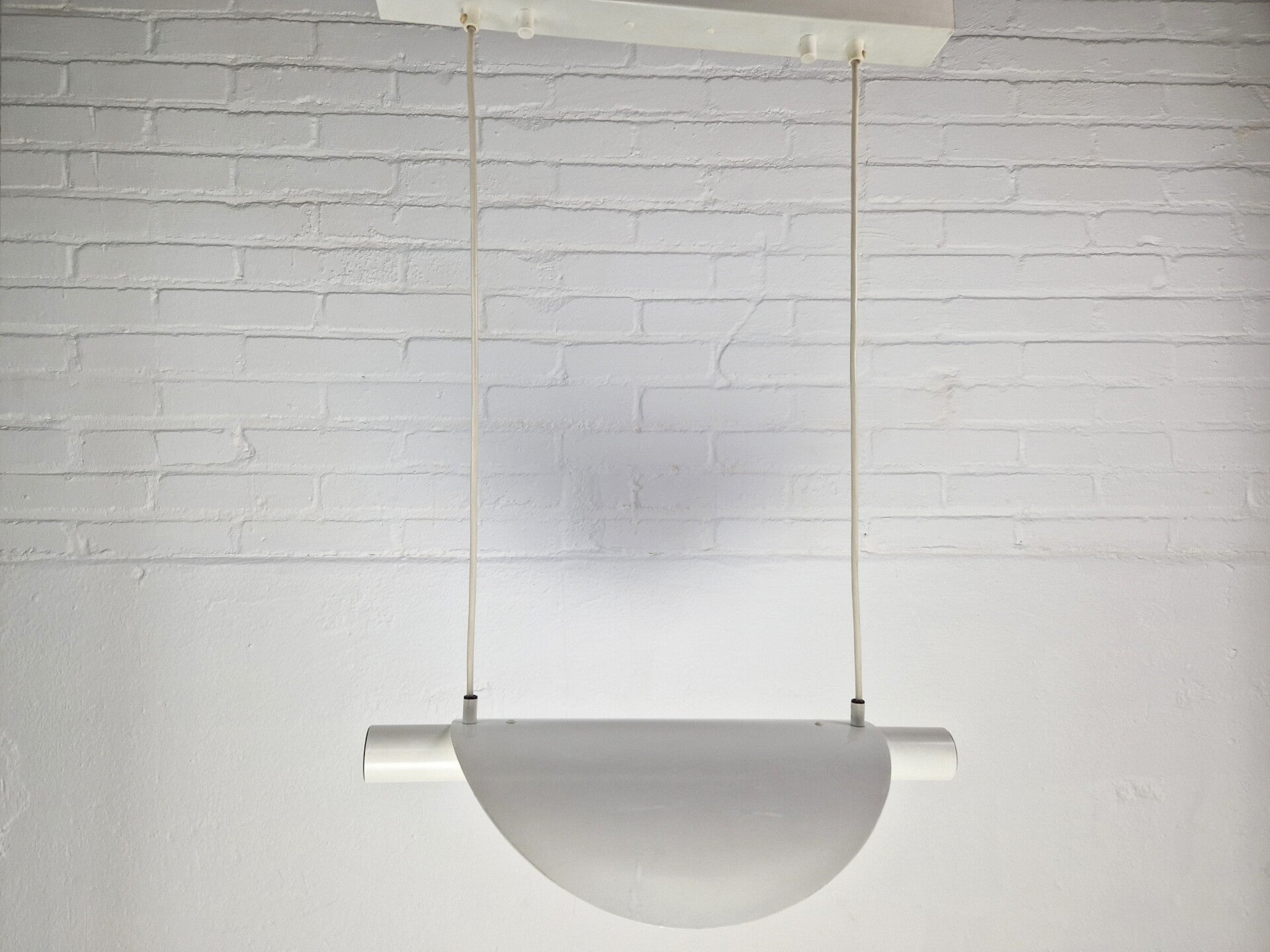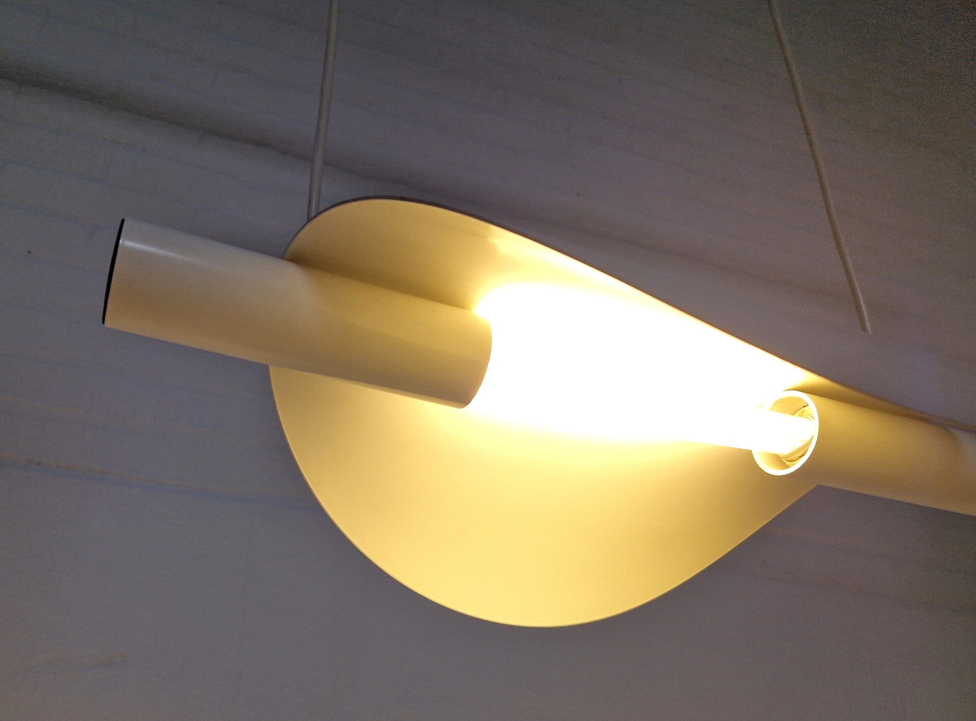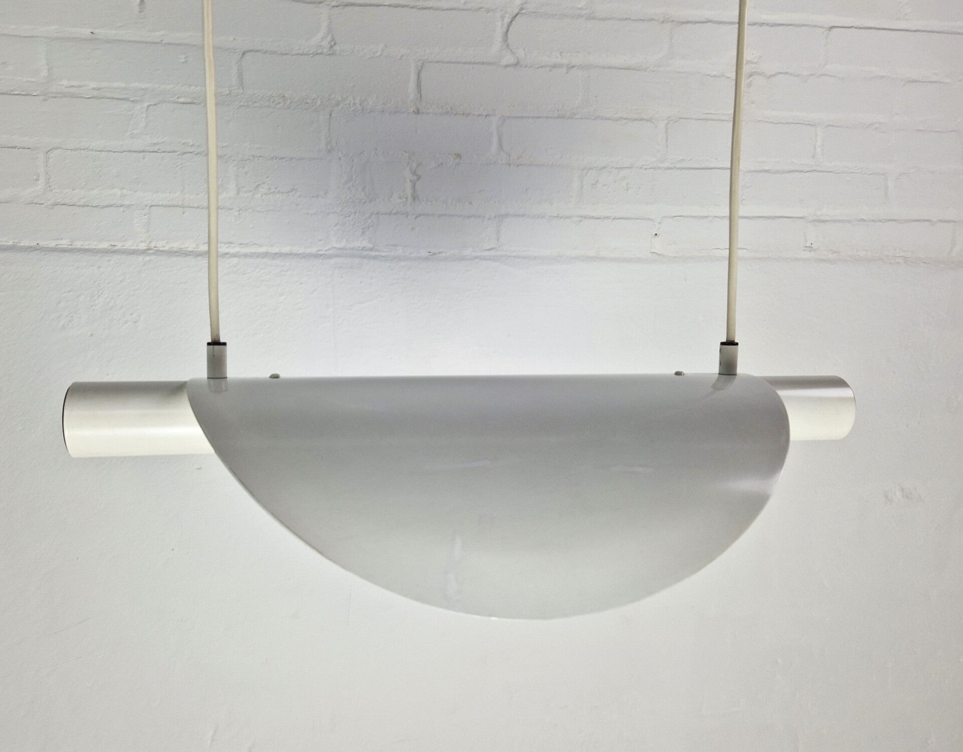 Fantastic postmodern ceiling light by Dutch company Dijkstra, made around 1980. The design is really smooth and feels Italian inpspired. The lamp is in great codition without any dents or missing parts. It only had some minor paint scratches on the top of the metal shade, which we restored, but they are still visible up close, see picture. Wear consistent with age.