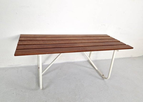 This is a great and super sturdy slatted bench with a steel frame and hardwood top. It can be easily used as a coffee table too as it is nice and deep. The frame has been painted white at some point. Great condition. There is one small natural hairline in the wood.