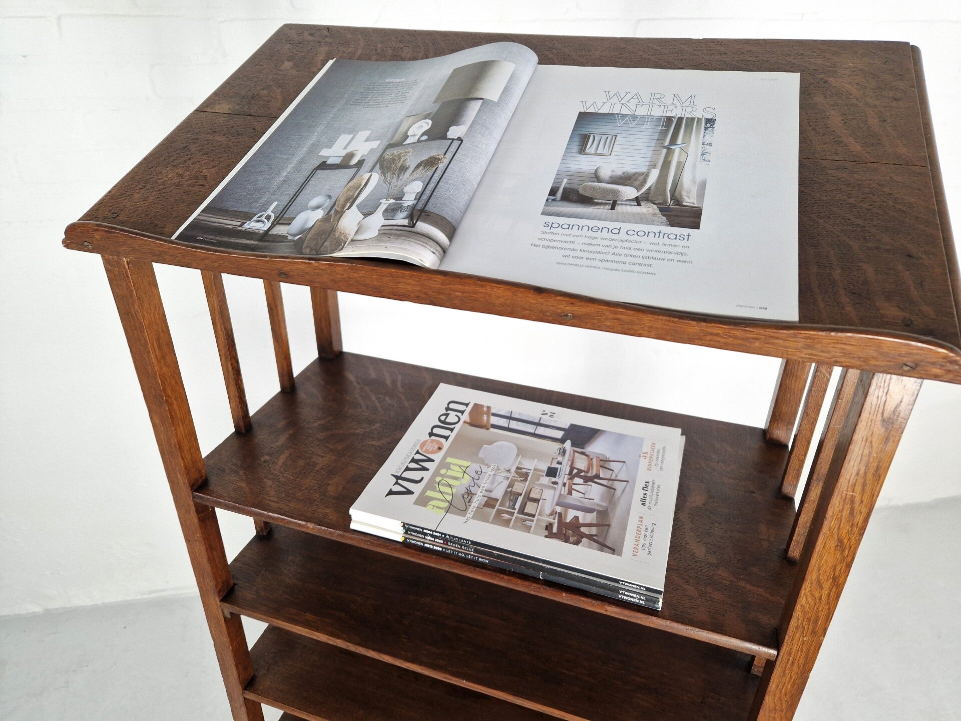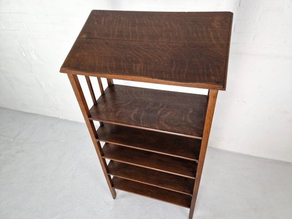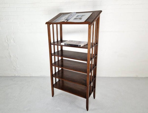 This sleek oak rack features a slanted top, perfect for displaying books, magazines, or even as a sheet music stand. It's likely from around 1915, just before the Art Deco period. In excellent condition with a small chip on the side of the top.