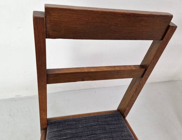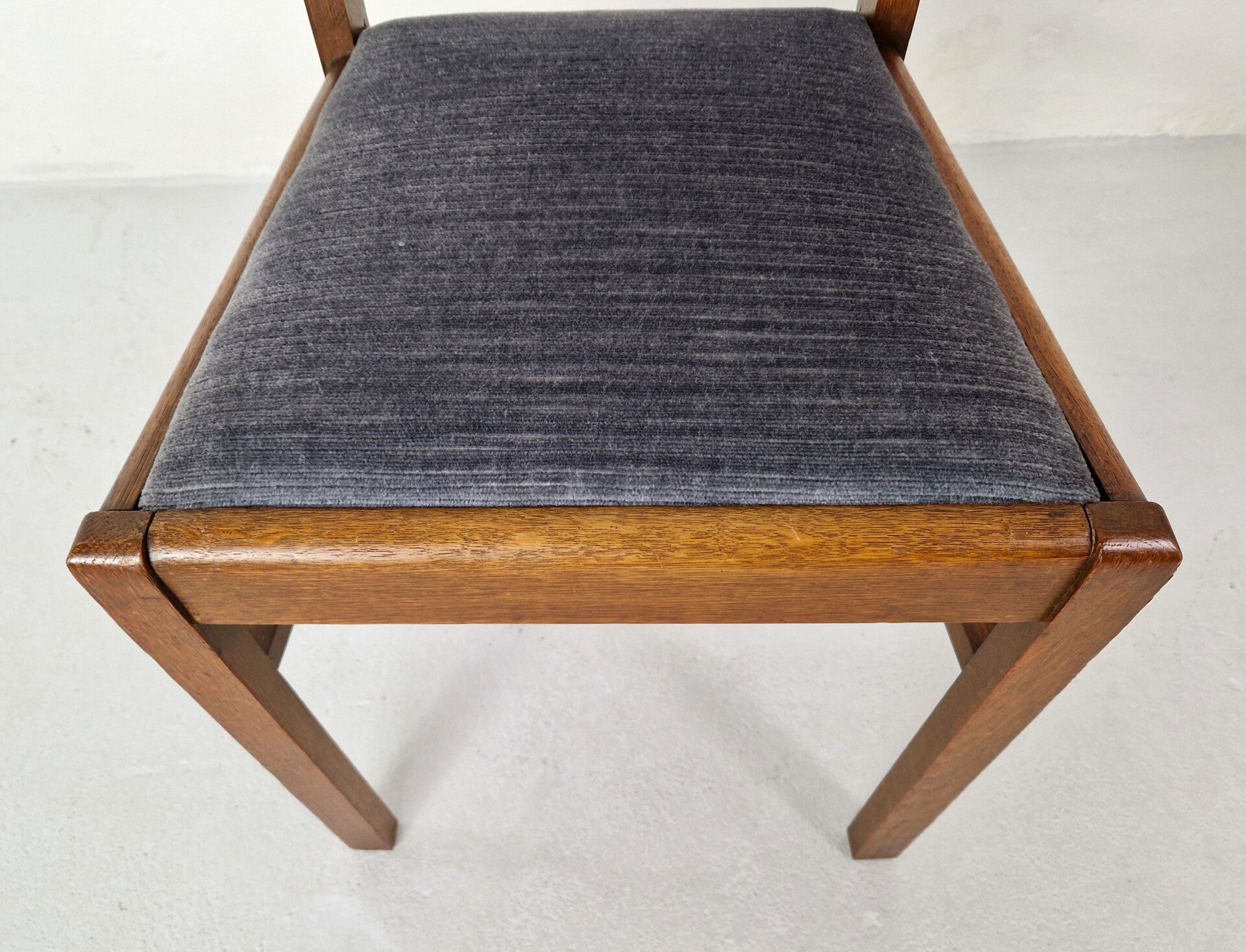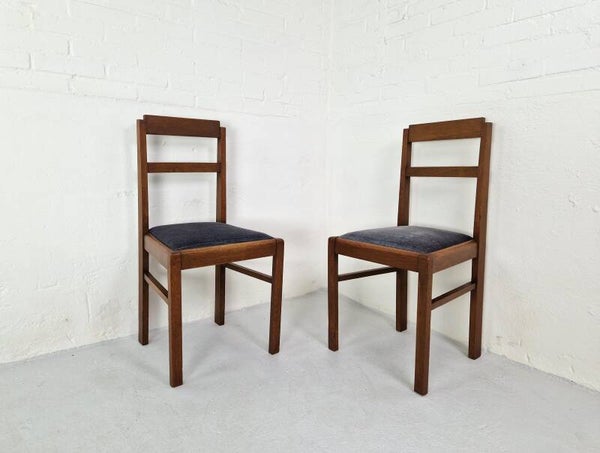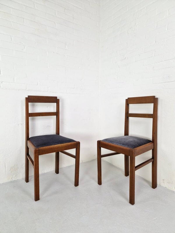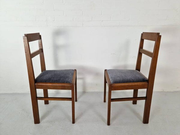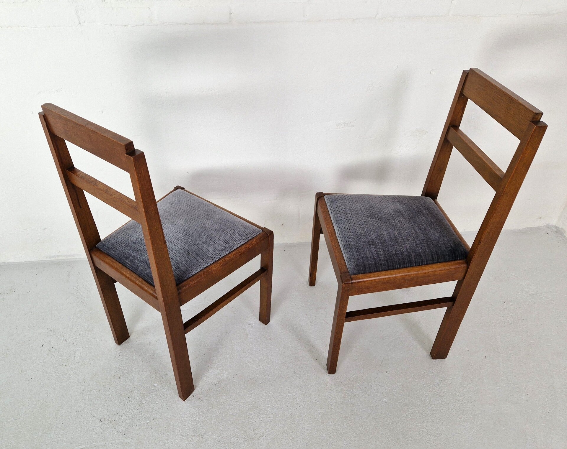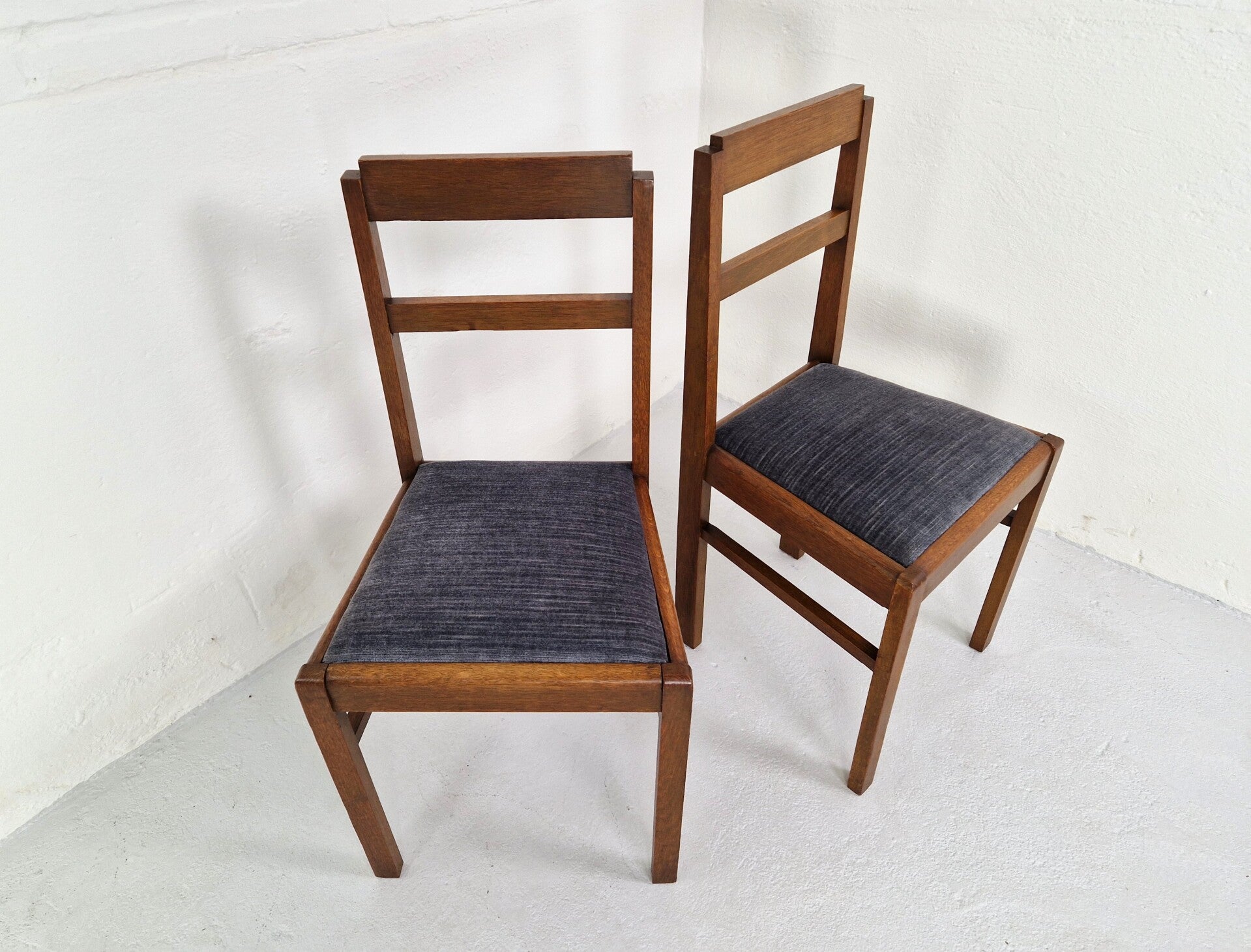 Wonderful pair of Dutch (Haagse School) Art Deco chairs in oak, probably made around 1930. They really make a room, can be used as a pair in a hall or bedroom for instance. Nice blue upholstery without stains or damage.