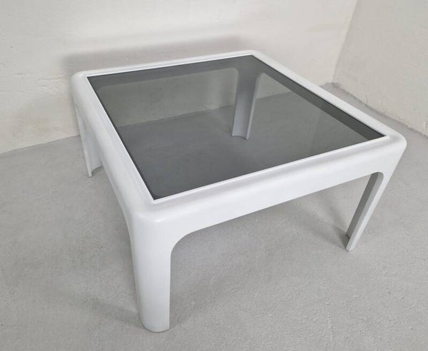Completely resprayed coffee table from the Horn Collection from the 1960s. This table is Space Age through and through, designed by renowned designer Peter Ghyczy. Beautiful gray smoked glass and rounded shapes, freshly painted white.