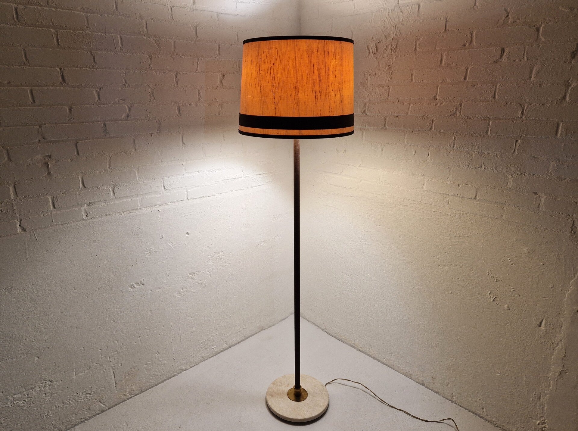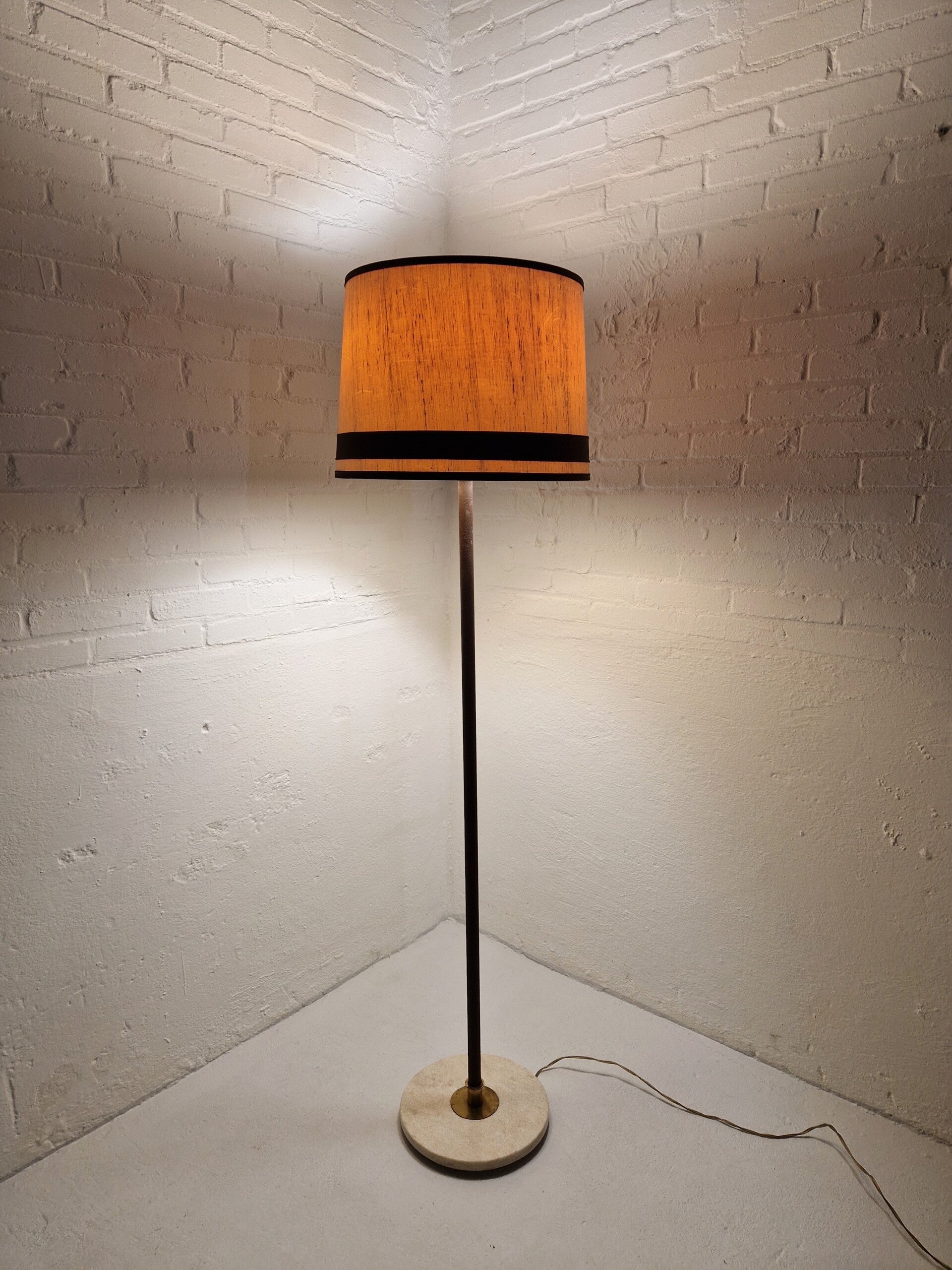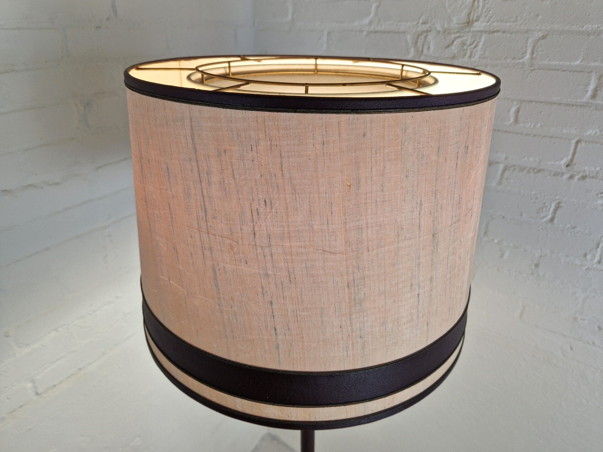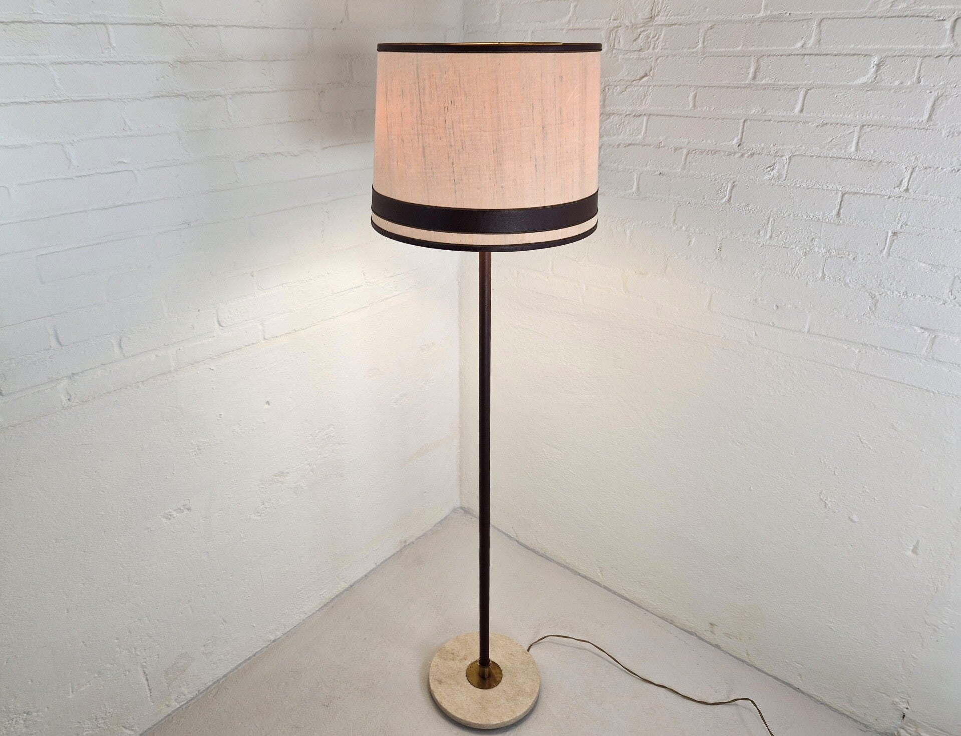 Fantastic floor lamp with two switches and three bulbs, one of which shines upwards. Beautiful bonded leather around the stem, a marble base, and brass accents. The beauty of this lamp is that it clearly shows signs of age, but the original shade is still very beautiful. A very atmospheric lamp!