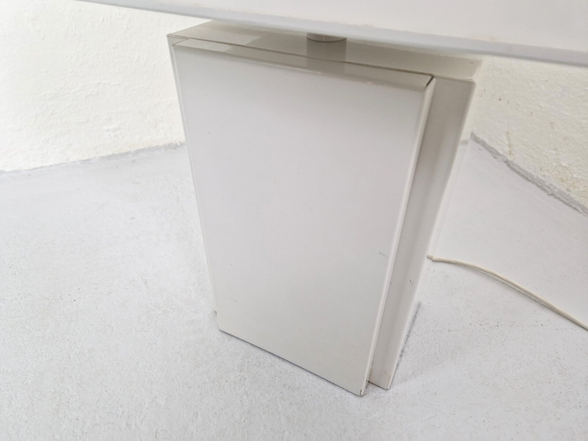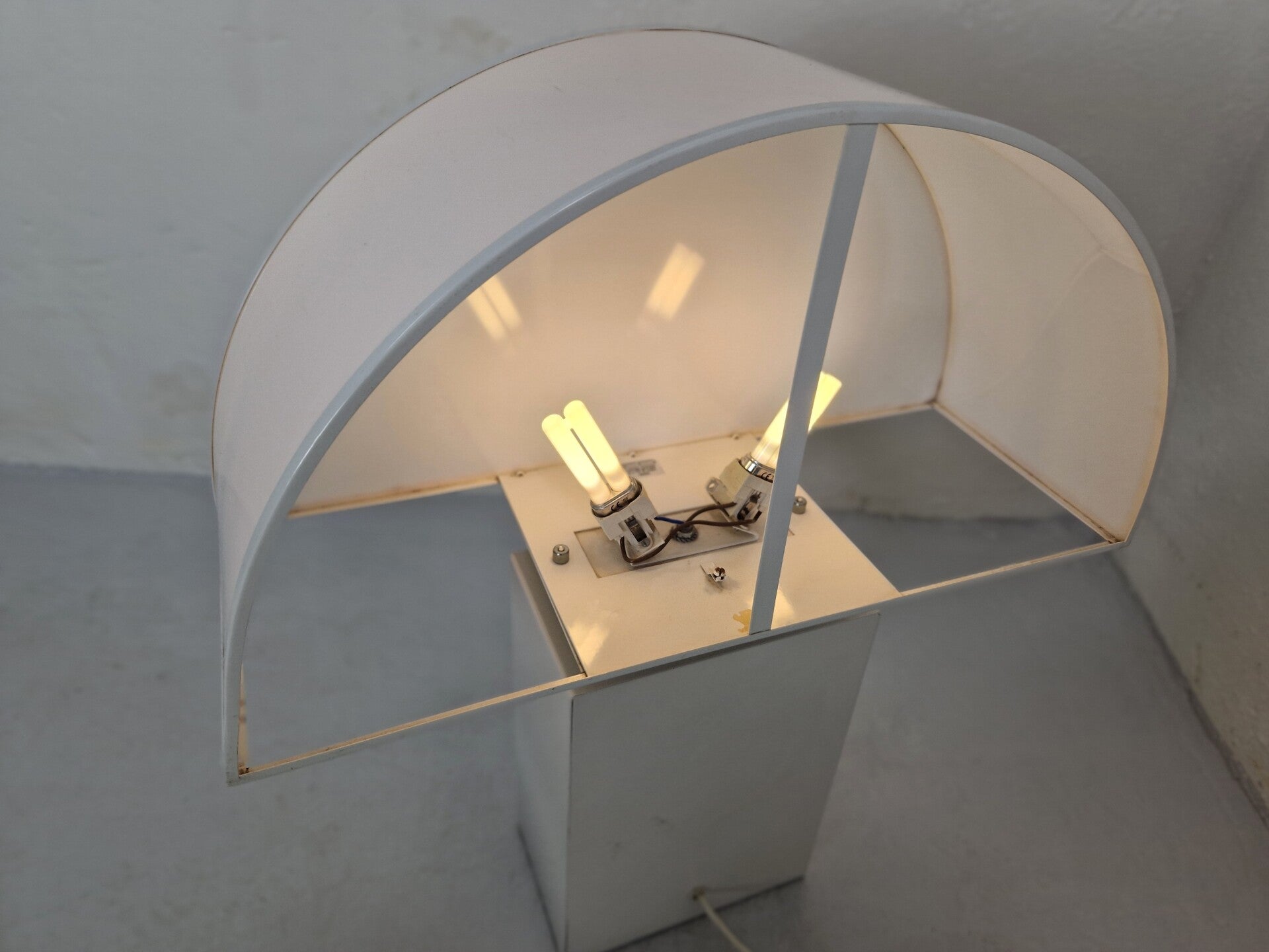 The condition is great for its age with minor paint wear and superficial scratches on the plexi shades. One little dent on the back metal rim but not visible when in use). This is the exact same lamp as our other, except for the bulbs. This one uses standard PL type tube lamps (still available).