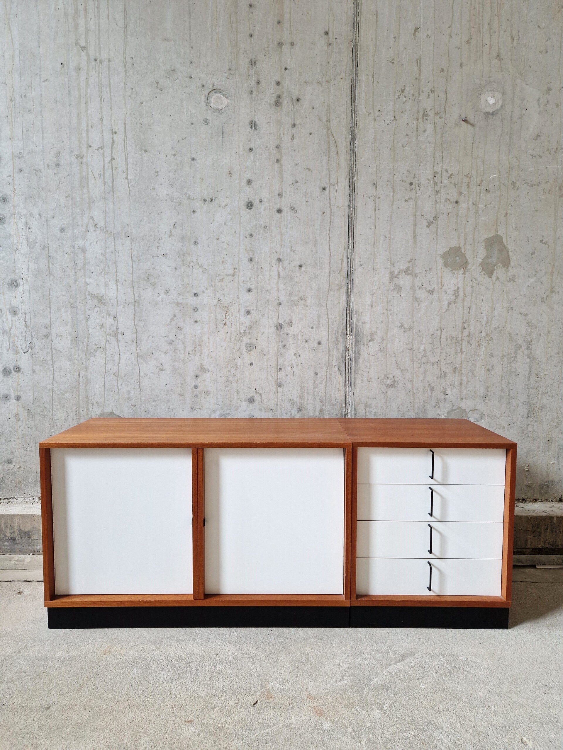 This amazing 1960s modernist sideboard is so cool it hurts. Designed by Günter Renkel for Rego Moebel, Germany in the 1960s. The two parts (drawers / doors are seperate pieces!) can be placed against each other to form one cabinet or they can be used apart. The white fronts contrast with the teak veneer and the upward facing handles are the details that really set this piece apart.