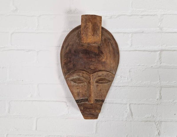 This carved wooden mask is a fantastic example of African tribal art, probably made somewhere in the mid 20th century. The shape of the face together with the amazing patina makes this mask a fantastic decorative piece, calm and understated. We believe it could be a Fang (Ngil) mask but we are not sure (let us know if you know!). Great ethnic wall piece!