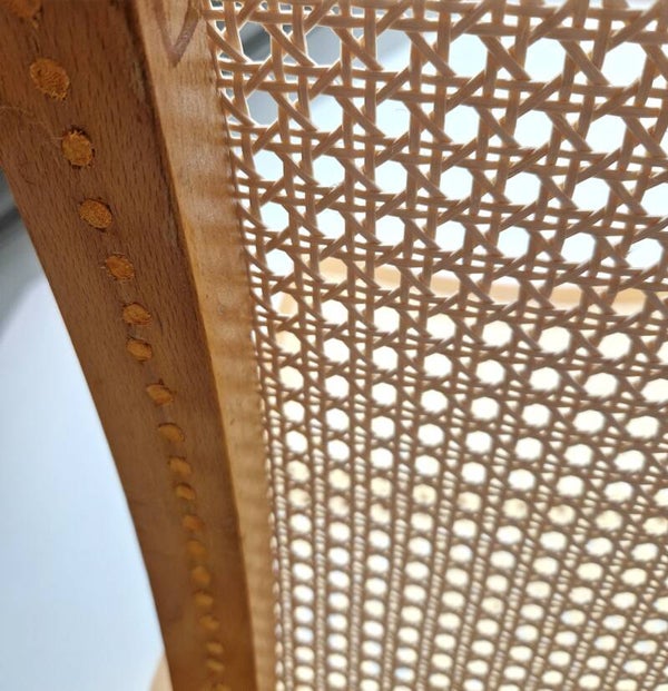 This iconic lounger was designed by Pascal Mourgue for Triconfort in 1984 and is called 'Arc'. It has a removable foot deck and the back is adjustable in three positions. This piece has been completely restored (signs of use still visible) with new cane webbing and is waiting for a new home.