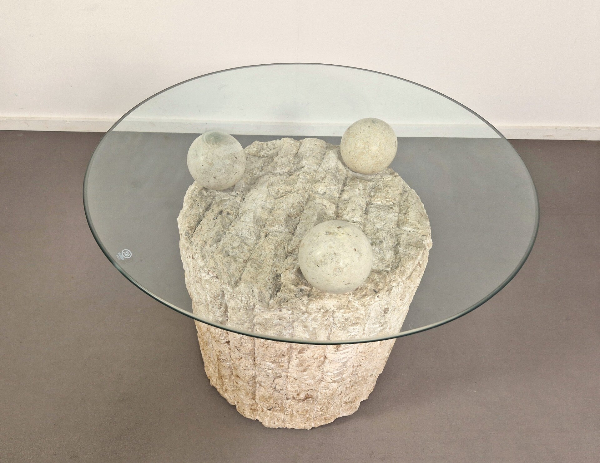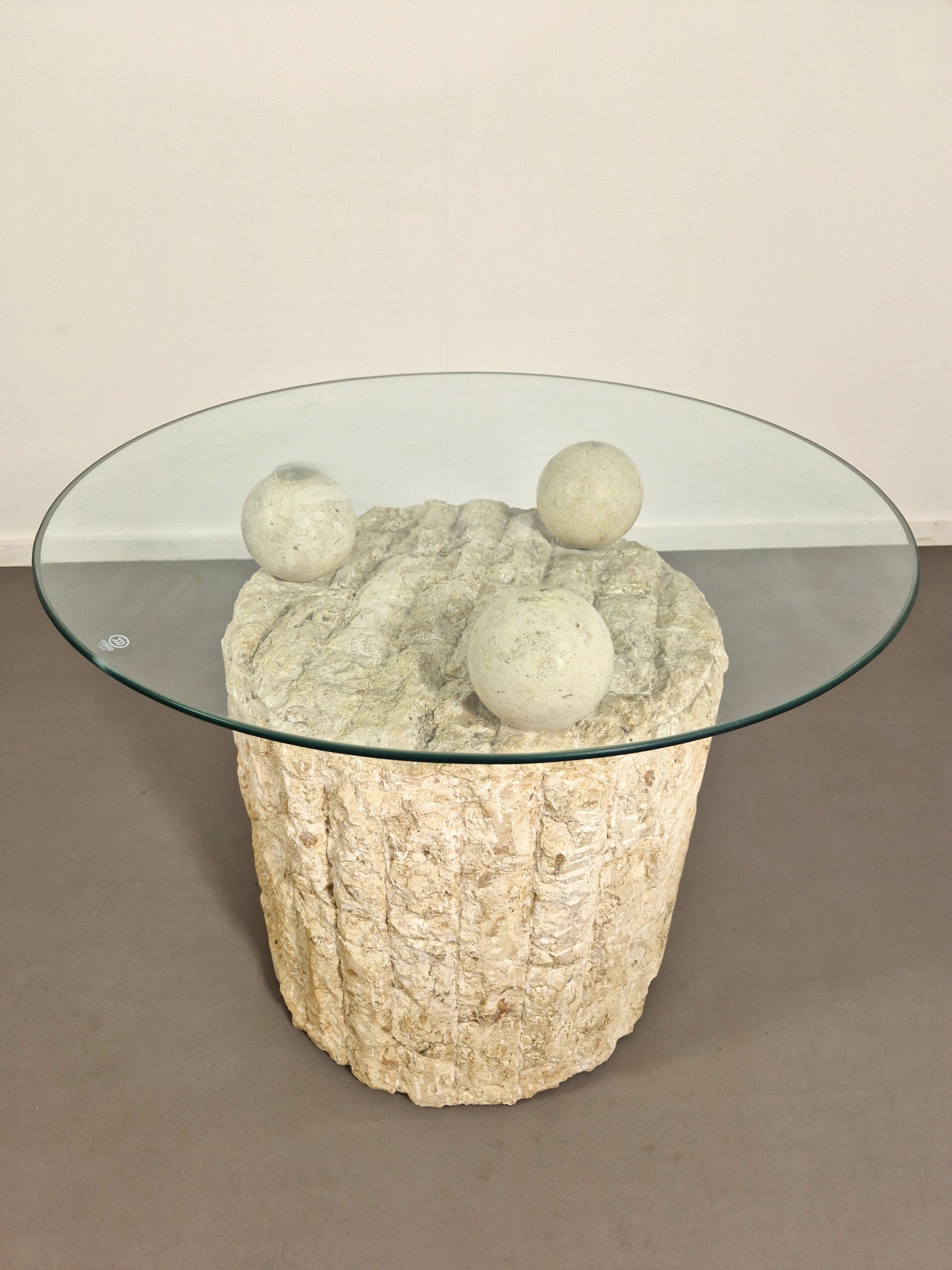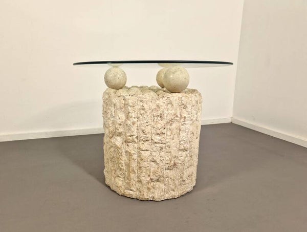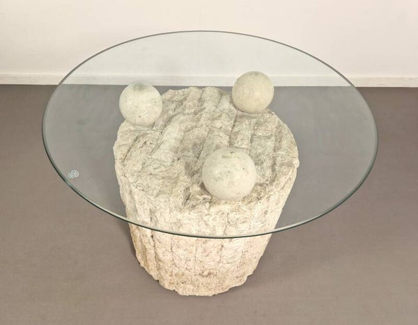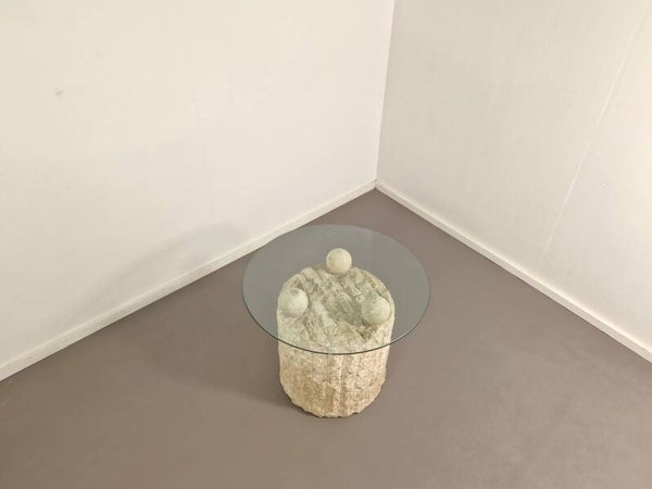 Highly sought after postmodern coffee (or side) table by Pierre Magnussen Ponte. The base is made from Mactan stone with three stone balls that hold the removable glass top. Good vintage condition. Glass top has been replaced. Circa 1980.