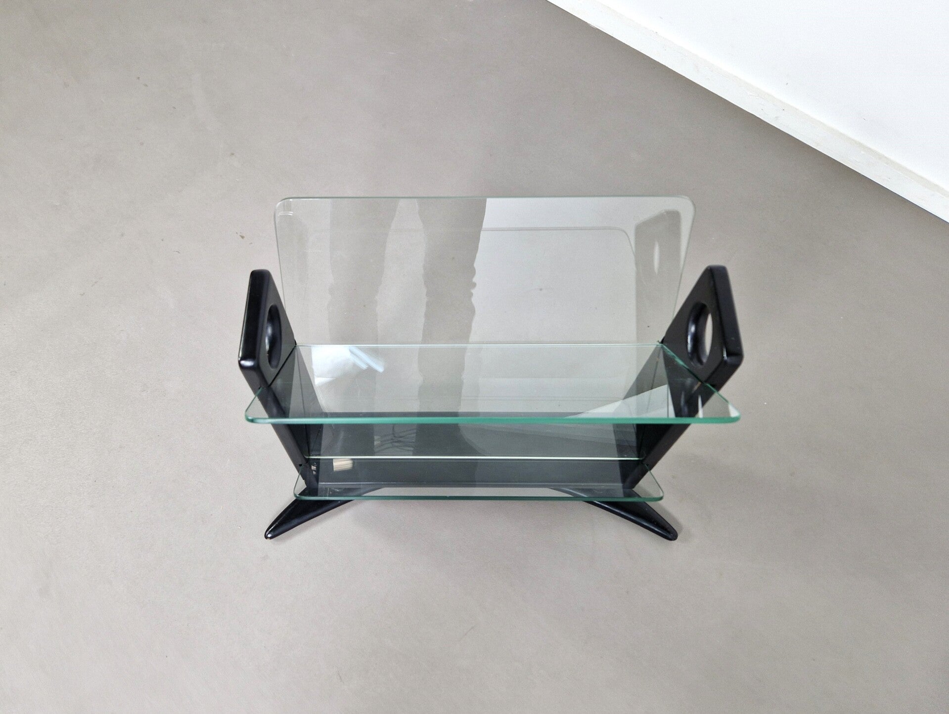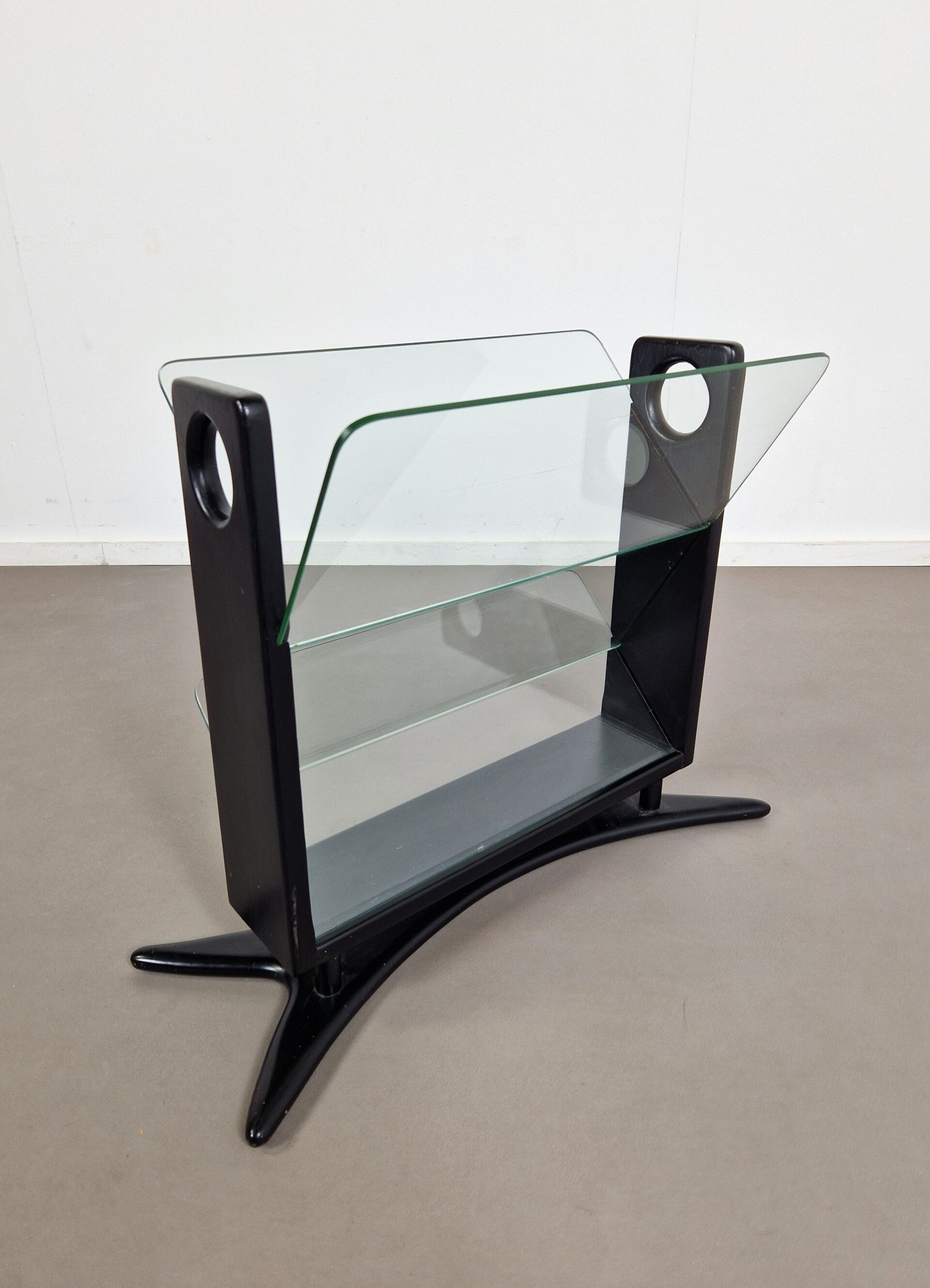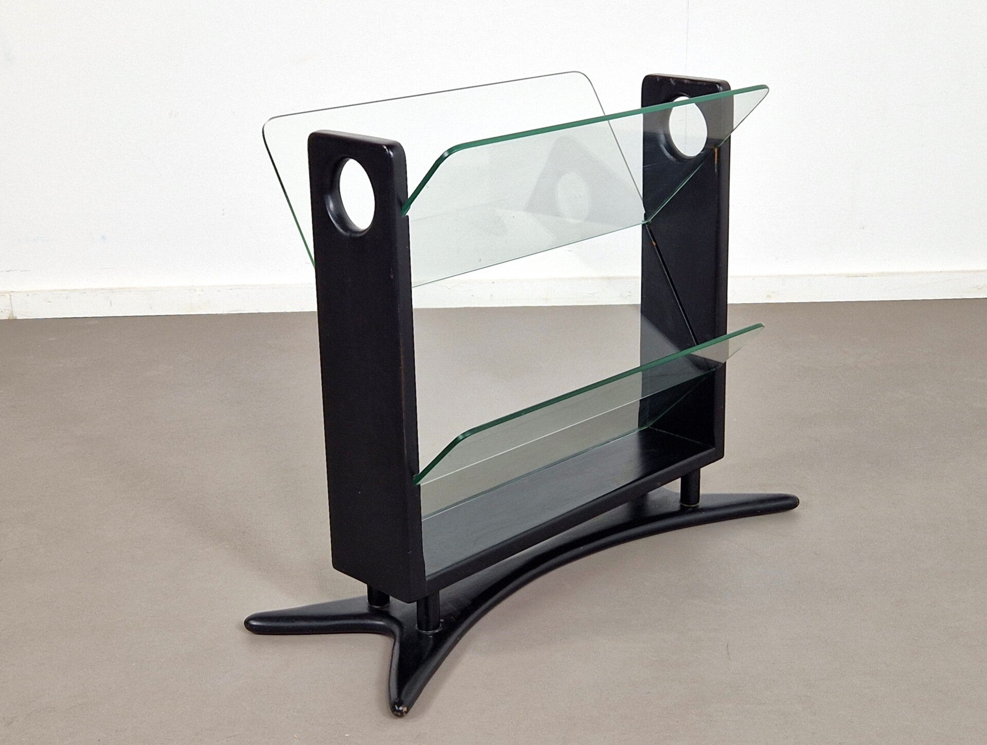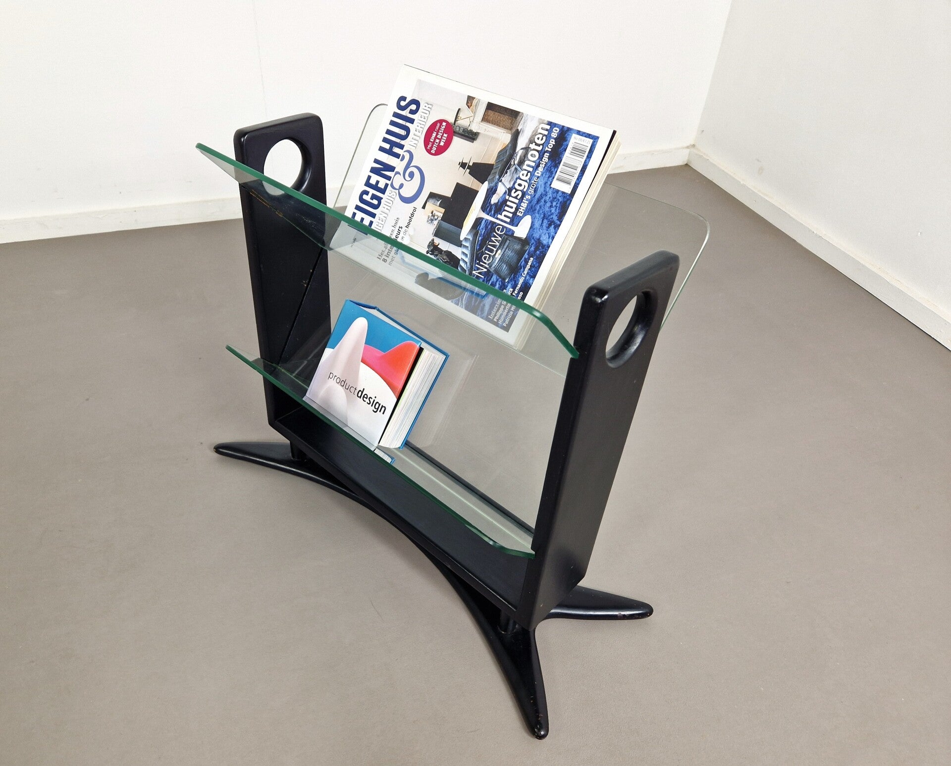 Stylish lacquered teak and glass magazine rack in nice vintage condition. The design is very much in the style of Italian designer Cesare Lacca, but it could be also made by Gelderland after a Lacca design. Some wear on the paint and wood but the glass parts are very good, no chips.