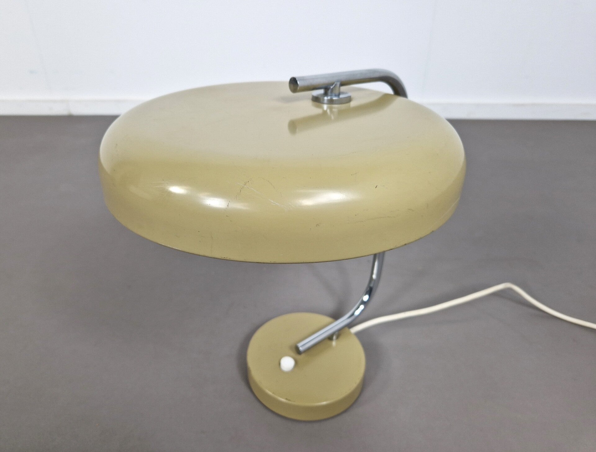 Great mid-century desk light in Bauhaus style by Hustadt Leuchten, West-Germany. The lamp has a green/beige color with a chrome rod. Classy piece!