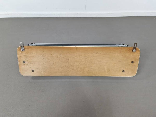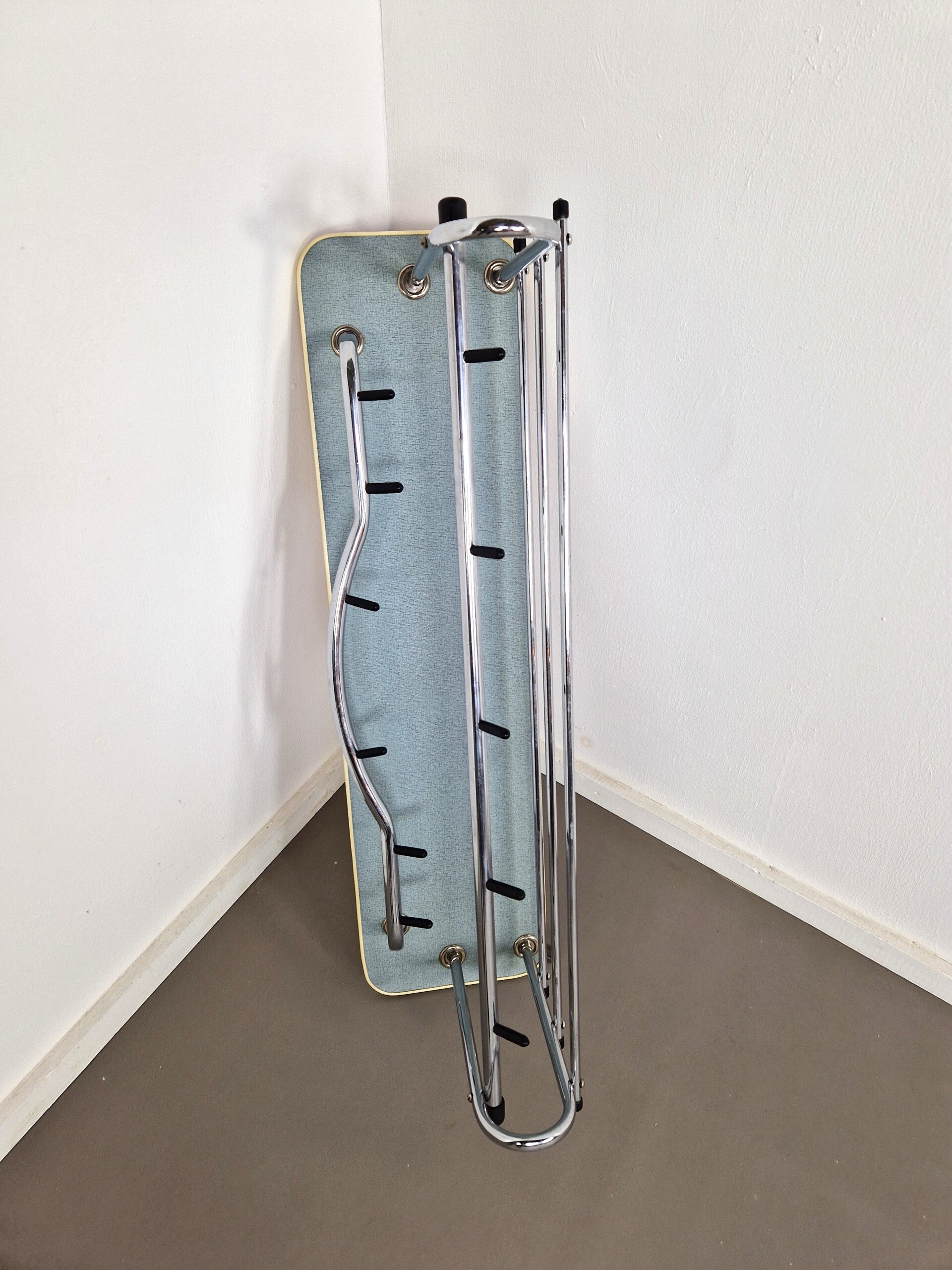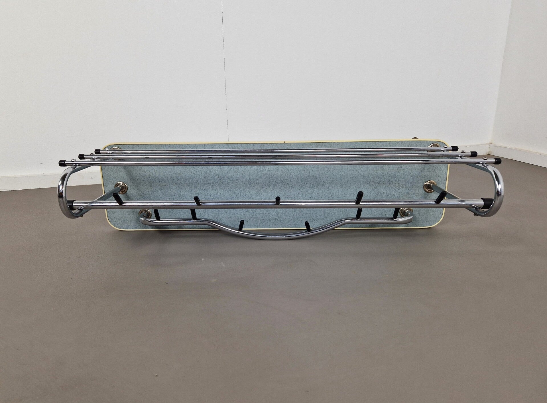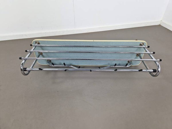 Chrome, faded blue, black rubber caps and a base of wood with a simple mounting system. Great style, very 'mid-century American car'. Holds your coats and also some stuff on top.